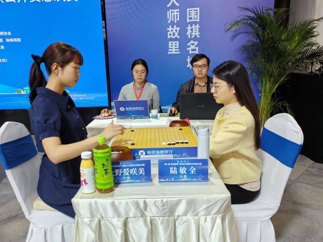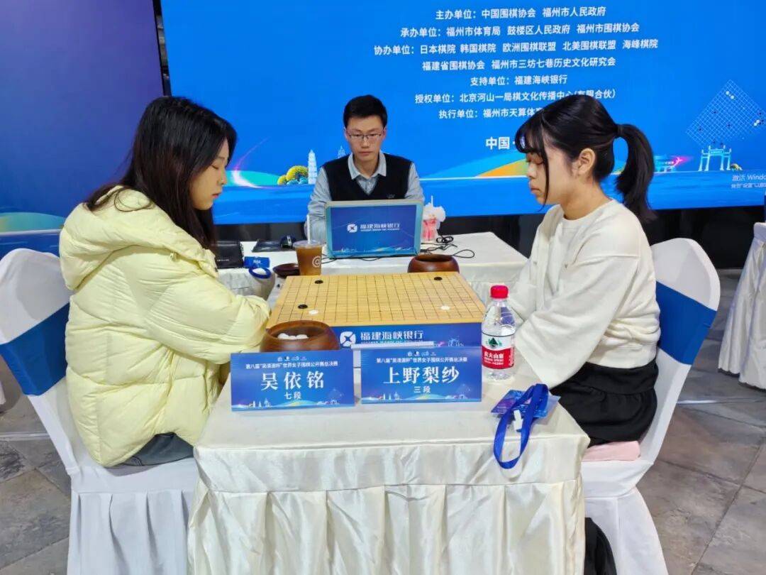陆敏全七段执黑对上届冠军上野爱咲美六段,中盘时尚为相持局面,临近收官时黑棋凑白棋围住中空,白棋胜势确立;吴依铭七段执白对上野爱咲美六段的妹妹上野梨纱三段,序盘白棋过于用强,在右下角送吃一块,早早陷入败势。