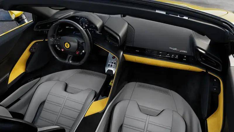 内饰方面,法拉利849 Testarossa Spider在法拉利Berlinetta车型结构布局的基础上,融合了单座赛车的水平仪表盘与座舱设计。仪表盘上方,铝质边框勾勒出字母C形出风口,营造出悬浮视觉效果;仪表盘上下部分由一条对比鲜明的水平饰带衔接,该区域整合了主要控制按键与副驾驶显示屏。仪表盘下部的两个极具建筑美感的帆形结构元素,巧妙整合了一系列控制功能,其中位于方向盘侧的帆形构件采用悬浮式设计,并集成了源自法拉利F80的换挡机构。