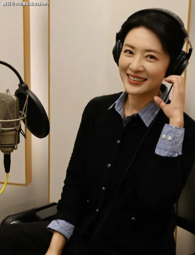 在穿搭中,色彩的和谐搭配是打造高级感的关键,周涛的 “黑色针织开衫 + 蓝白条纹衬衫” 造型,就将色彩平衡的技巧展现得淋漓尽致。