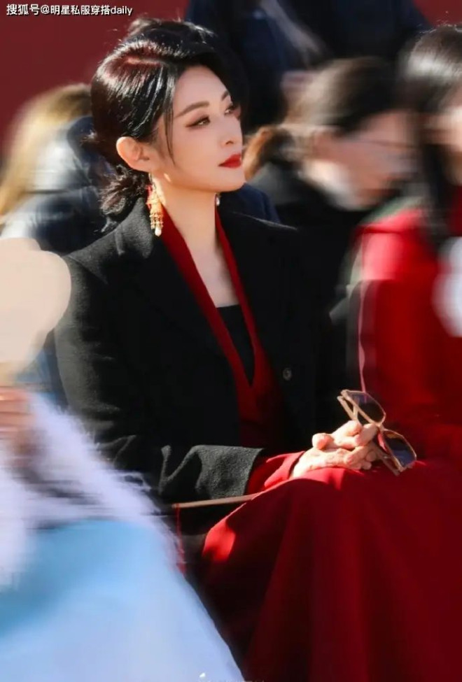 而当她身穿黑色西装外套搭配大红色长裙时,配饰的 “缺席” 反而成就了另一番惊艳。黑色西装的沉稳与大红色长裙的热烈形成强烈反差,碰撞出极具张力的视觉效果,认真化妆后的周涛,将红色长裙的明艳与黑色西装的大气完美驾驭,无需过多配饰点缀,便凭借服装本身的色彩与版型,展现出超越年龄的惊艳气质。