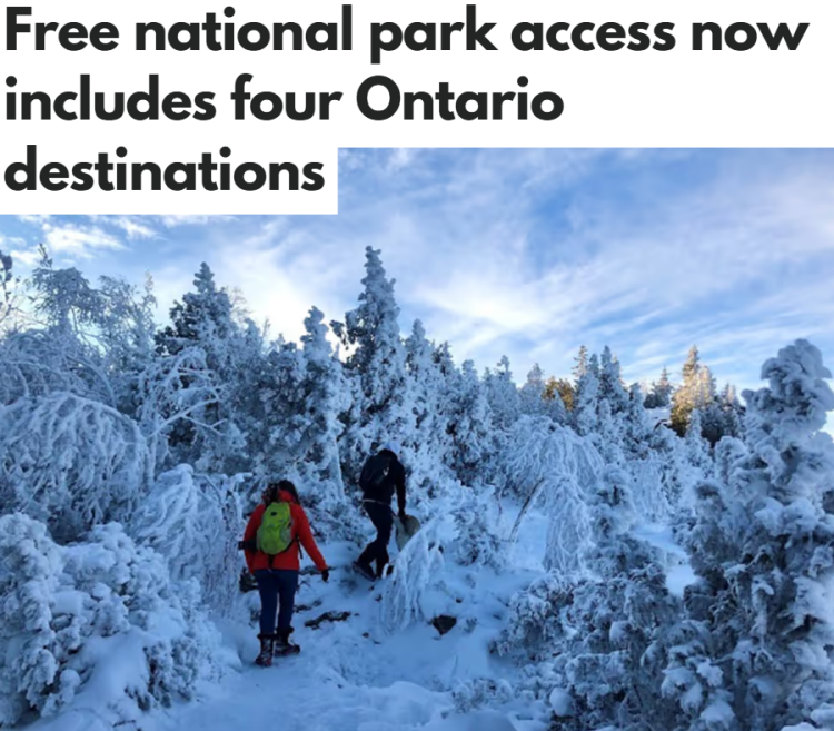 加拿大公园局宣布,自 12 月 12 日起,游客可免费进入全国所有开放的国家公园,包括安大略省的四个景点。