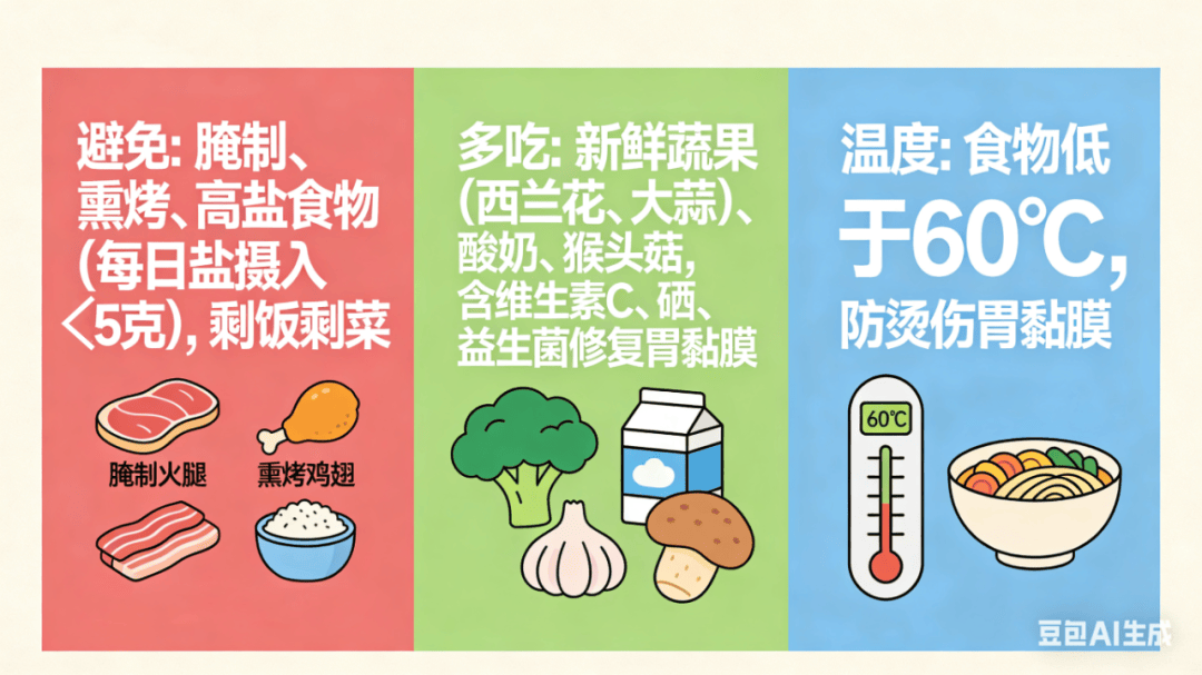 烟草中的亚硝胺会直接损伤胃黏膜,酒精会破坏胃黏膜屏障。建议:每日饮酒量不超过25克酒精(约50毫升50度白酒),吸烟者应逐步戒断。