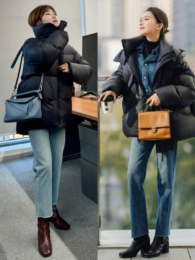 建议你选择一条牛仔9分裤来搭配上羽绒服外套,内搭一件针织衫就行,还可以加上一件蓝色的牛仔衬衫,就能让穿搭者穿出简约干练的造型,通勤时髦。