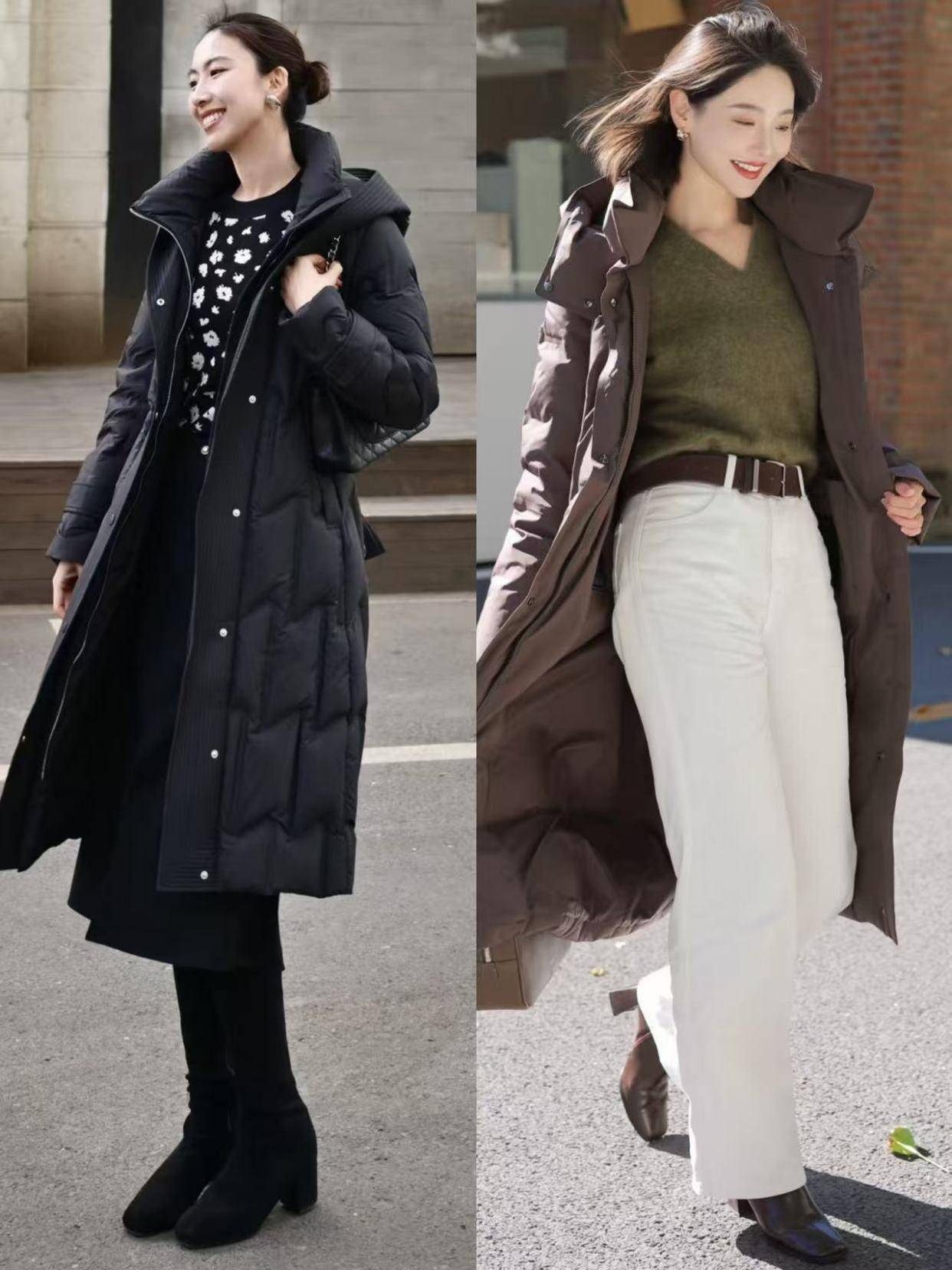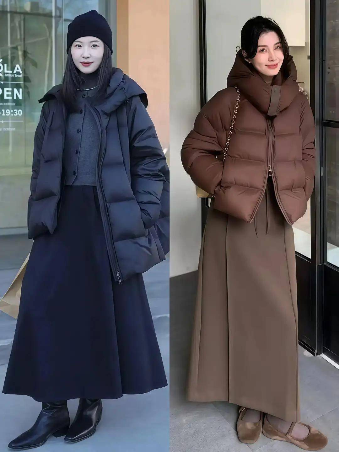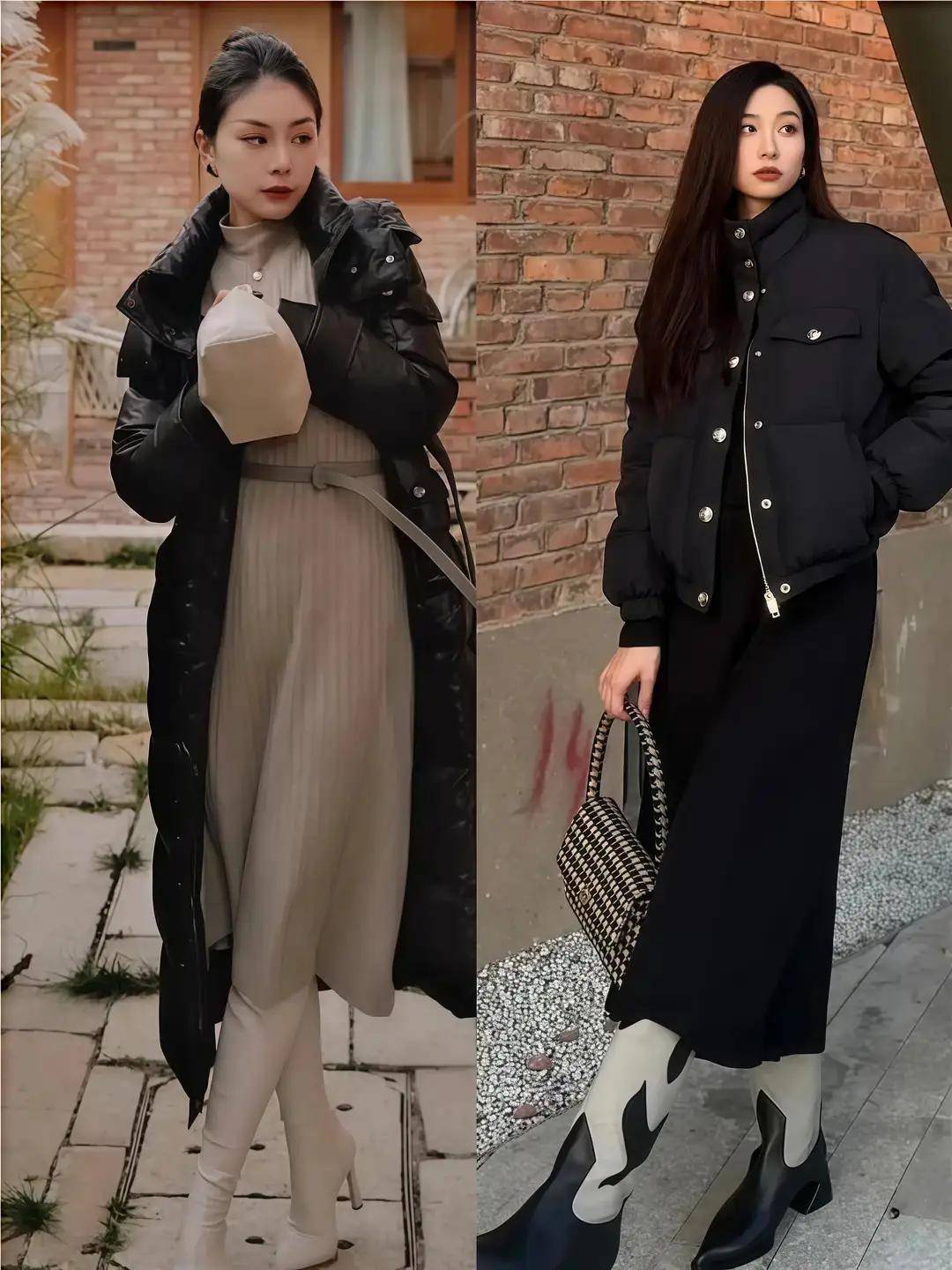 同样是穿的一条连衣裙作为内搭,但是羽绒服外套长度不同,呈现出来的效果也有区别,搭配方式细节上也要多加注意才行。