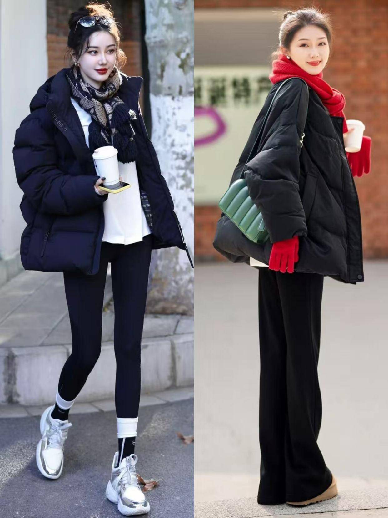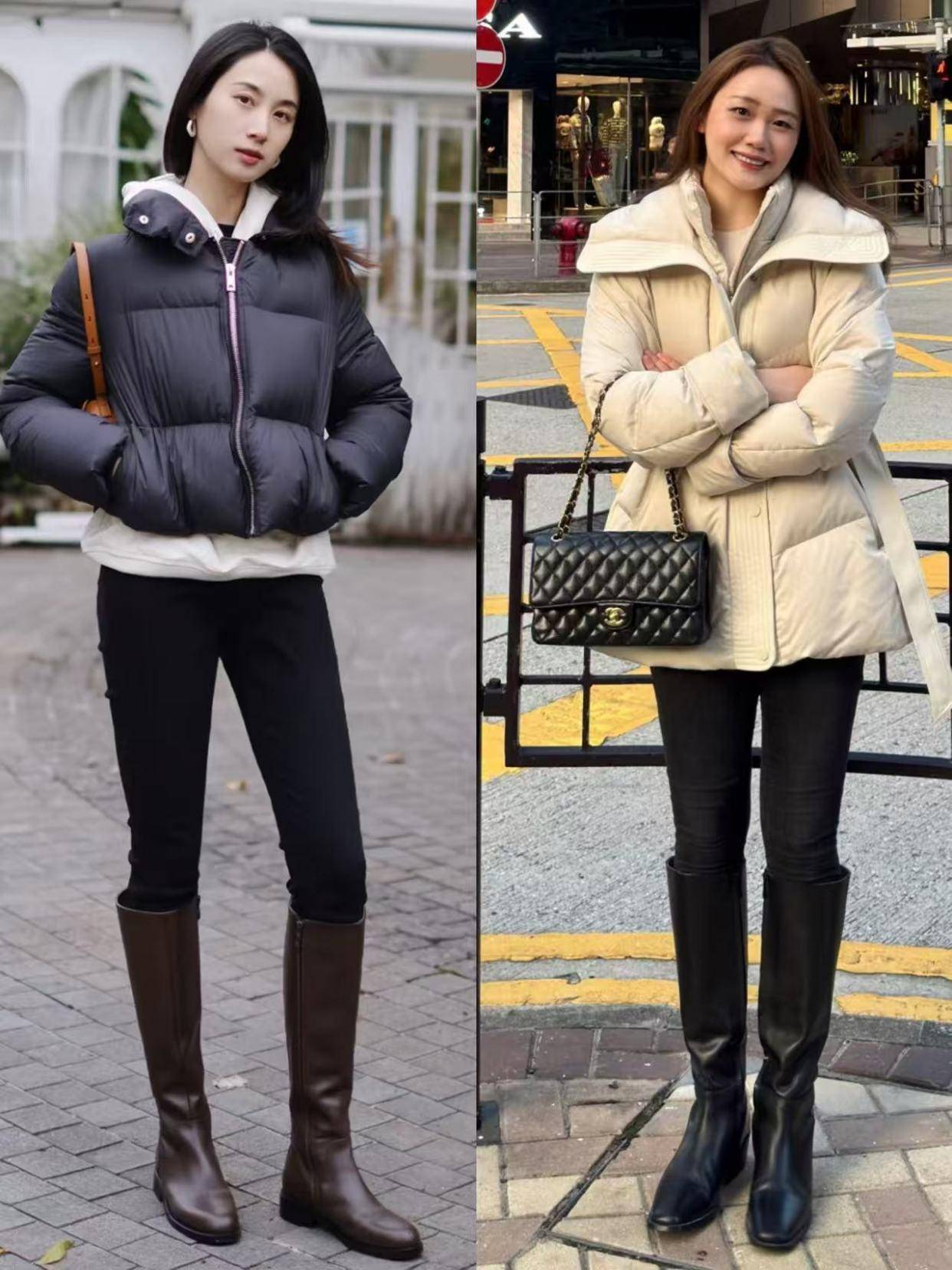 同样是穿了一件黑色的羽绒服外套,但是因为下装穿的不同,气质瞬间天差地别,当你穿的是一条紧身的打底裤,很容易暴露腿粗和尴尬区,显得不够得体。
