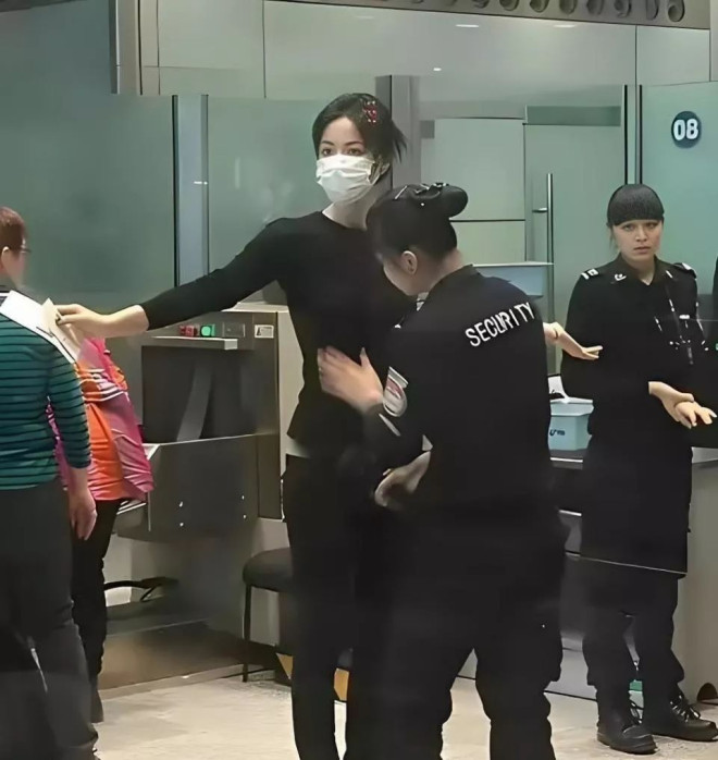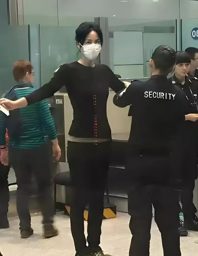 机场安检口的灯光下,王菲穿着黑色卫衣和牛仔裤,素颜穿过闸机。
