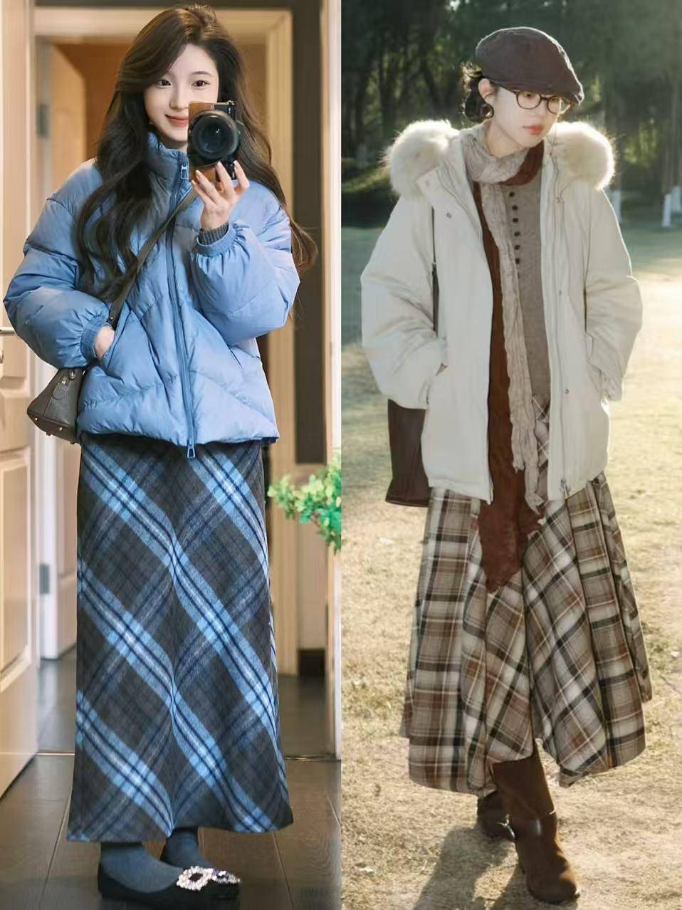 上面这种格纹的半身裙搭配上雾霾蓝和白色的羽绒服外套,换搭就不会使得穿搭者造型过于单调。