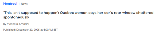 本月一个寒冷的早晨,魁北克省蒙特利尔市的郊区圣拉扎尔(Saint-Lazare)的一名女子怎么也没想到,自己汽车的后挡风玻璃竟然会“自己爆裂”。