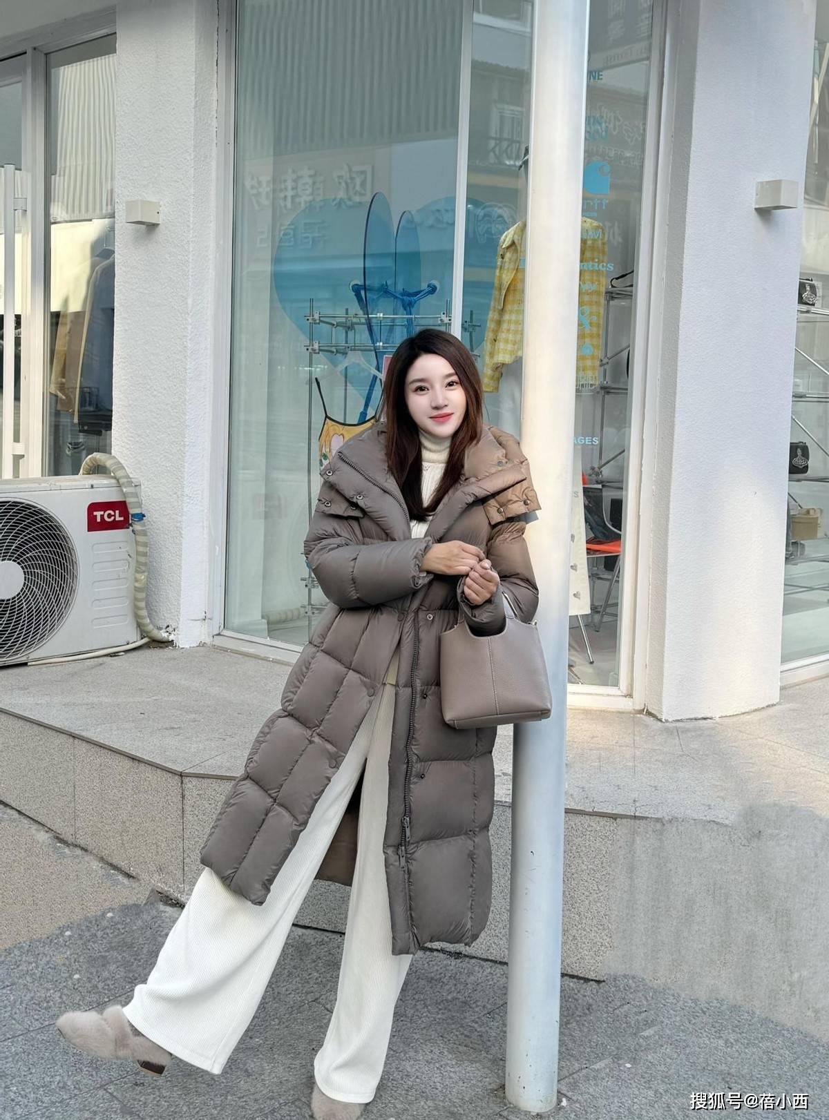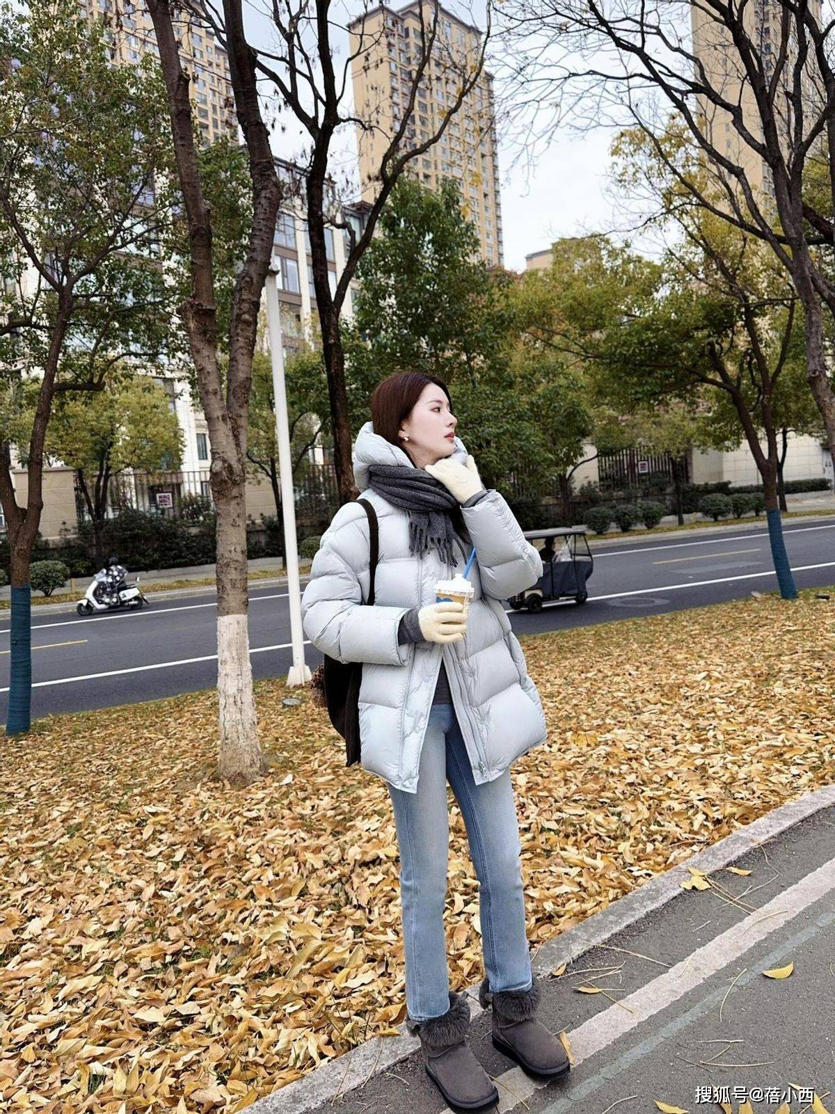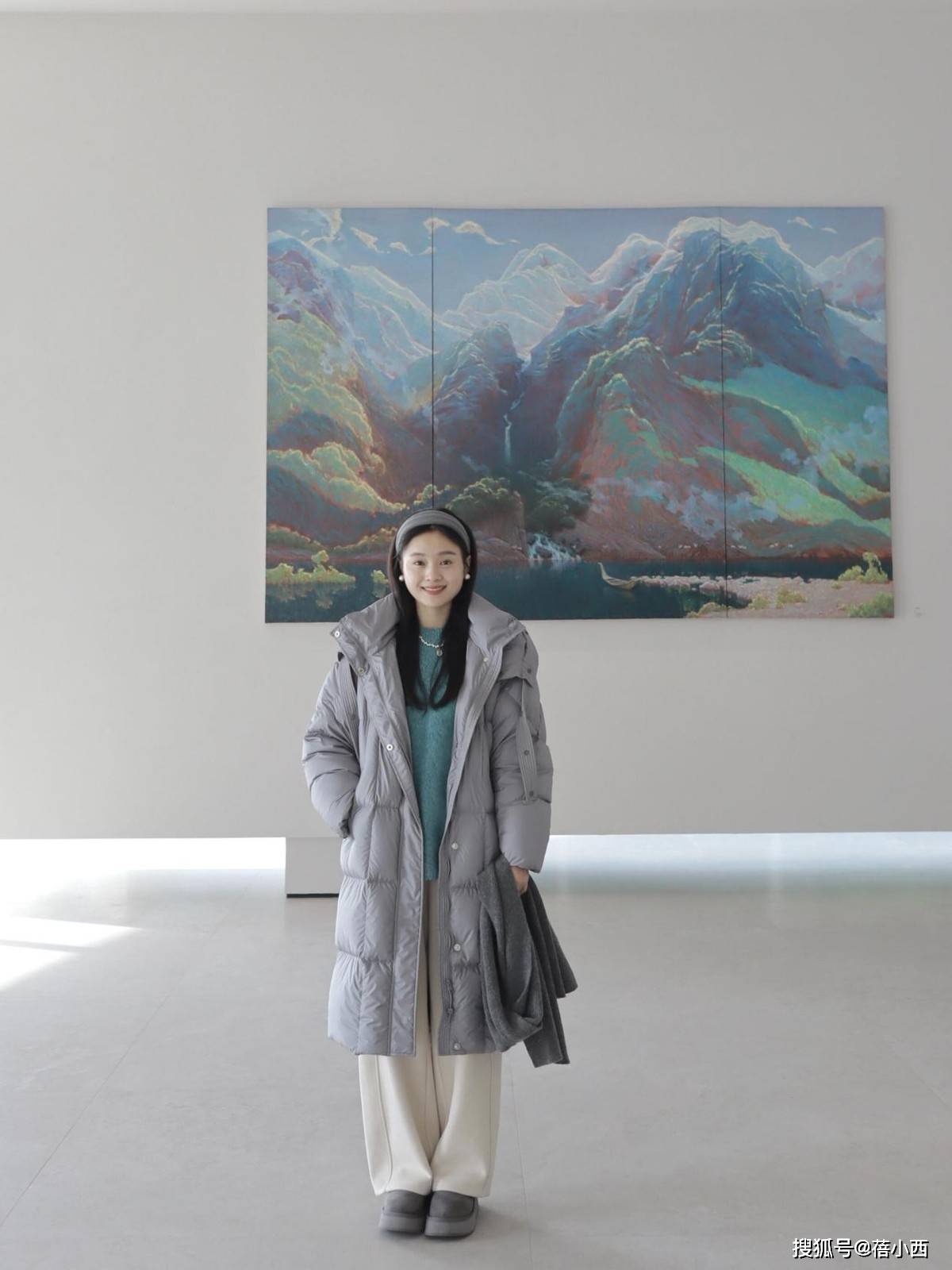 同色系的搭配是最不出错的搭配法,比如外面穿灰色羽绒服,里面搭配白色打底衫,下半身配白色阔腿裤和内搭呼应,整体色调统一又有层次,面料上羽绒服的顺滑和针织衫的软糯还可以形成对比,提个包包出门,韩系松弛感直接拉满,通勤穿低调又显贵。