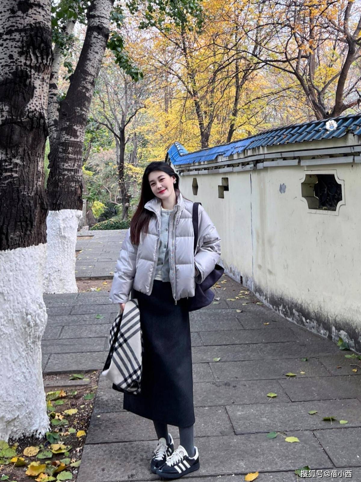 如果想走气质淑女风,灰色羽绒服搭配半身裙也不错,直筒半身裙可以修饰胯宽腿粗,降低搭配臃肿感,配合平底德训鞋,减龄极了。