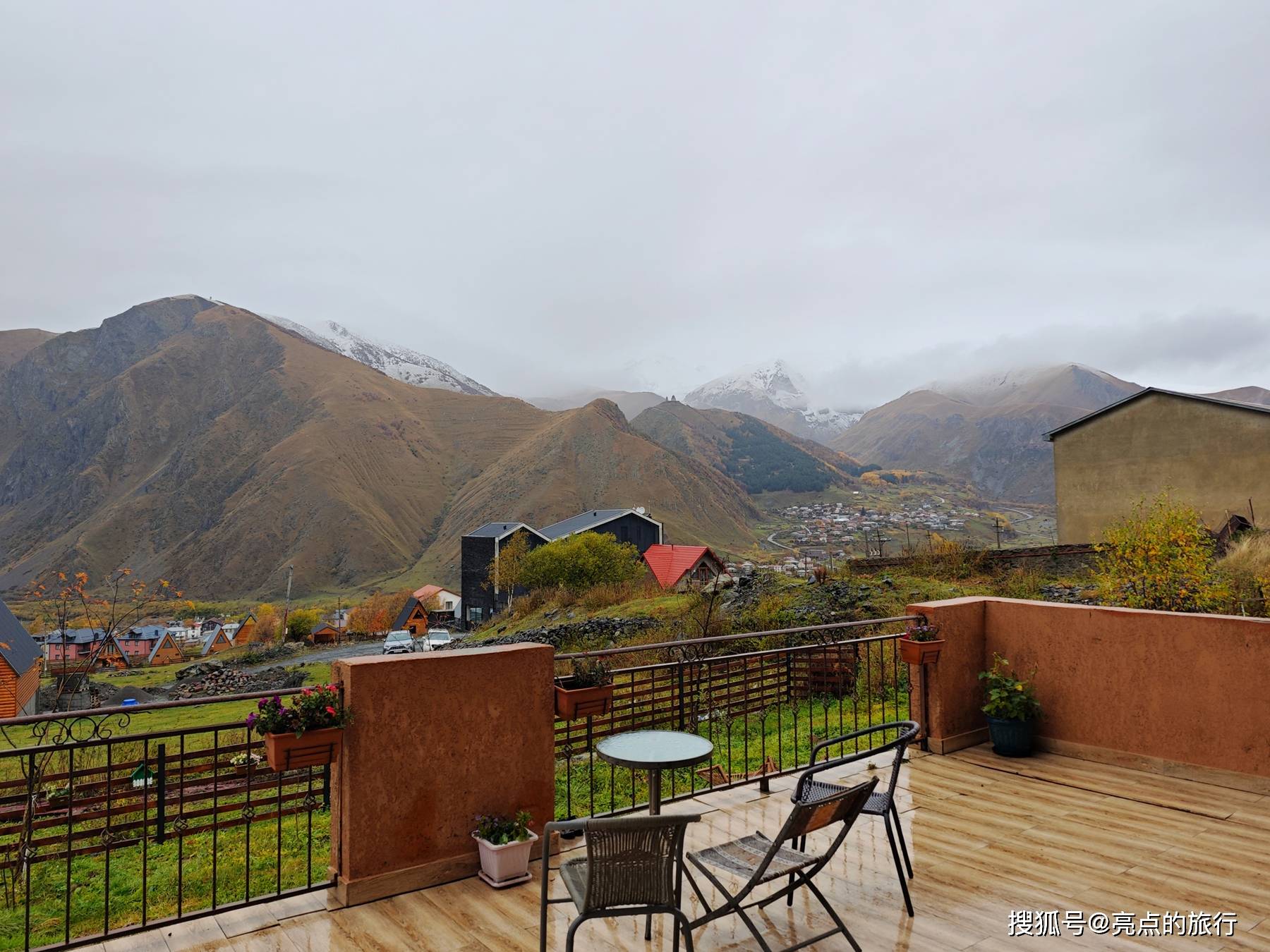 一起拼车的伙伴有4个是国内来的,有趣且聊得来,于是6个人订了同一家酒店。这家叫做Nikolo inn的民宿和网红的“卡兹别克客房酒店”只隔着一条马路,有同样的高度,房价却只有网红酒店的1/5.很超值。上坡路虽然走得有些累,阳台景观相当不错,有点像国内的川西。