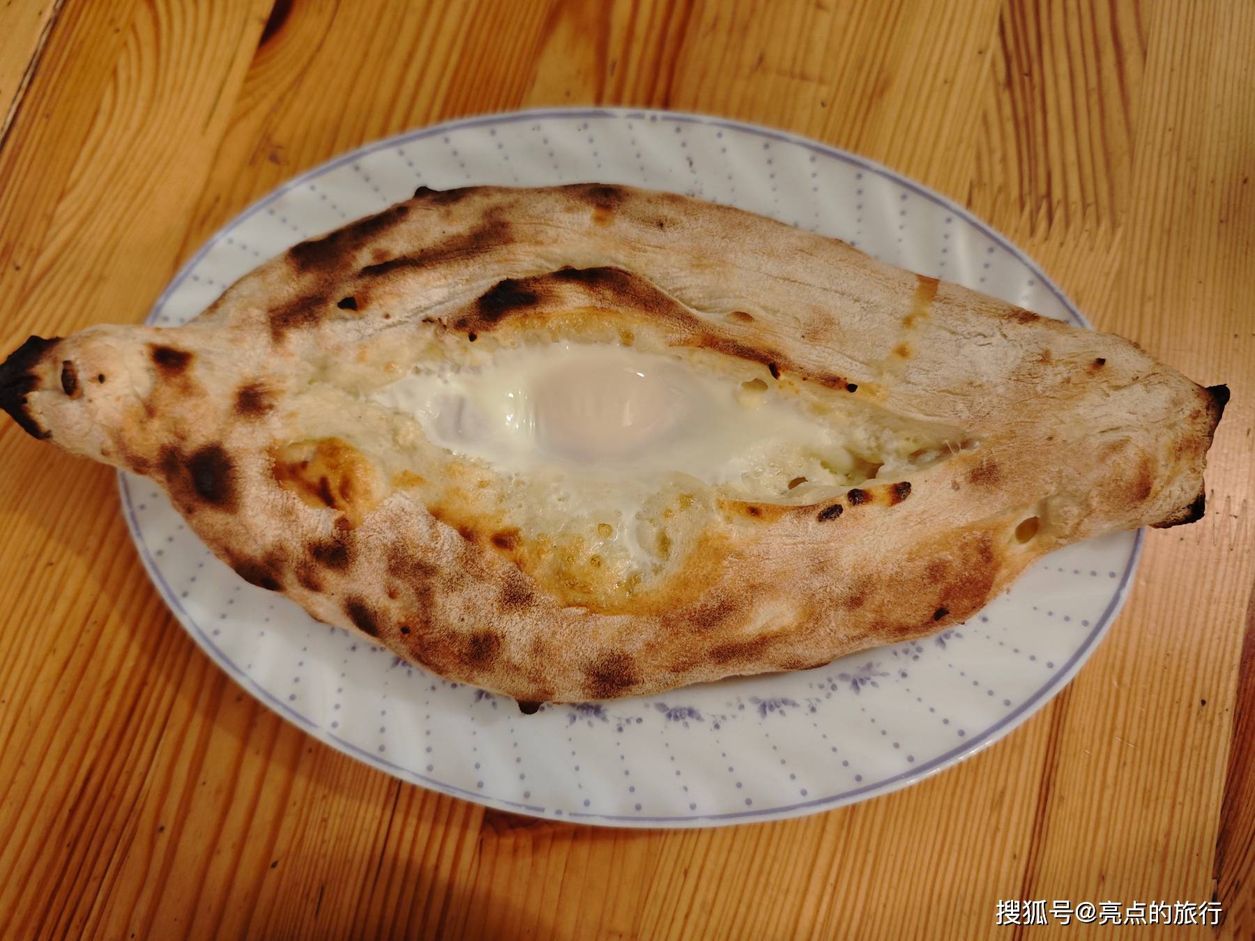 哈恰普里是格鲁吉亚的“国菜”,船形奶酪饼吃的时候在中间打一个生鸡蛋,和热奶酪搅拌在一起,用饼边蘸着吃。哈恰普里我们在阿拉木图吃过,很大的饼,差不多有一只成年人的鞋子大,6个人一个饼。