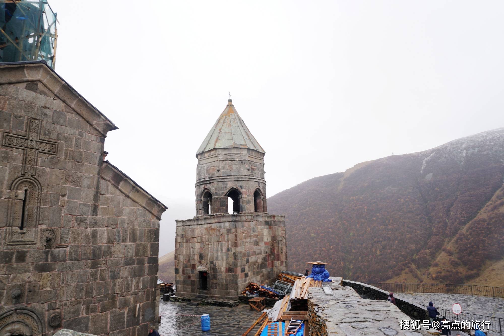 建于14世纪的教堂屹立在海拔2170米的山顶,四周是巍峨的雪山。曾经庇护宗教圣物,传说普罗米修斯被囚于卡兹别克山,在战乱年代曾保管过来自姆茨赫塔的珍贵文物(如圣尼诺十字架)。