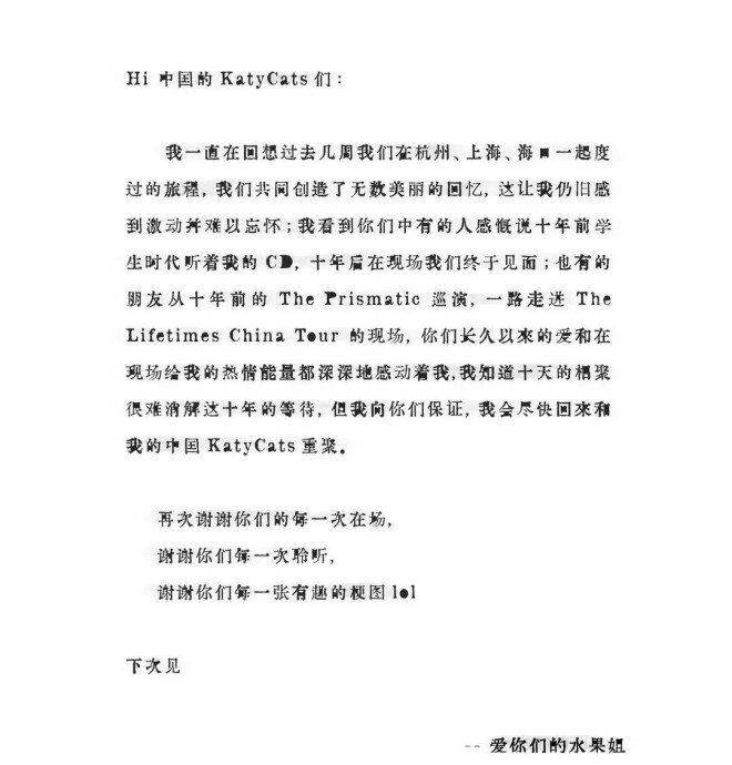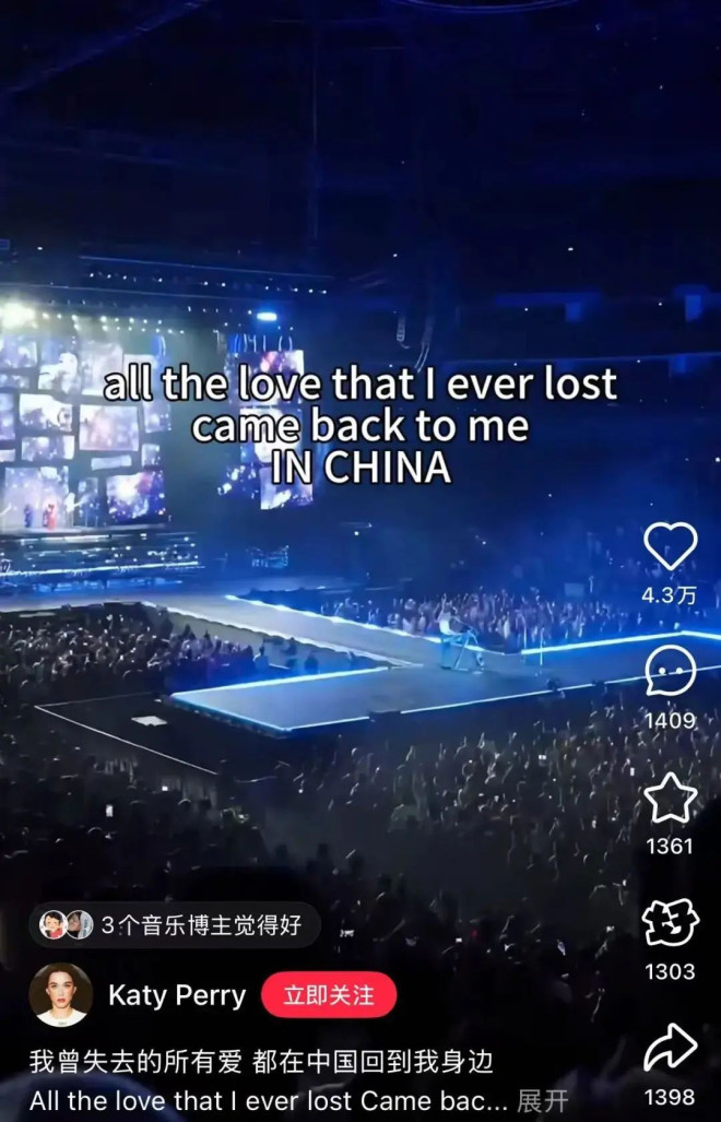 看到粉丝们对她的热情和欢呼,Katy发文说: “她所有曾经失去的爱,都在中国找回来了”。