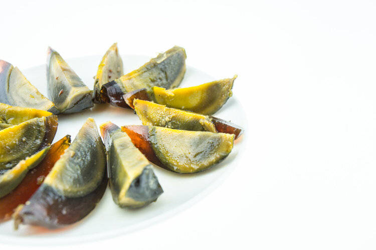 一个好皮蛋的诞生离不开金属助剂,其黝黑的外表就是金属离子与蛋白水解后的产物,传统的皮蛋做法中金属助剂多为黄丹粉,也就是氧化铅,这也是早期皮蛋被诟病铅残留的原因,