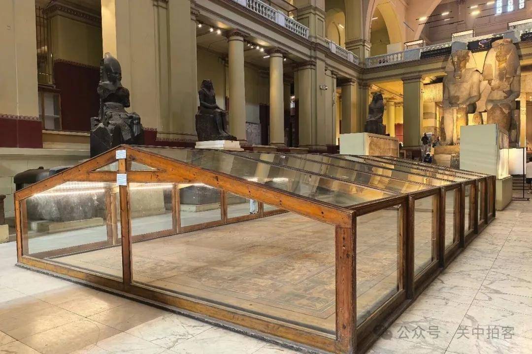 在中央大厅的地面,覆盖着一块玻璃罩,展示一大片出土于明亚省阿玛纳宫殿遗址的铺路石板砖,表面描绘了一座长方形池塘上方飞翔的鸟、游动的鱼、生长的莲花和纸莎草花等,以及一组努比亚人、库什人、海上民族、亚洲人、波斯人、利比亚人的图案。