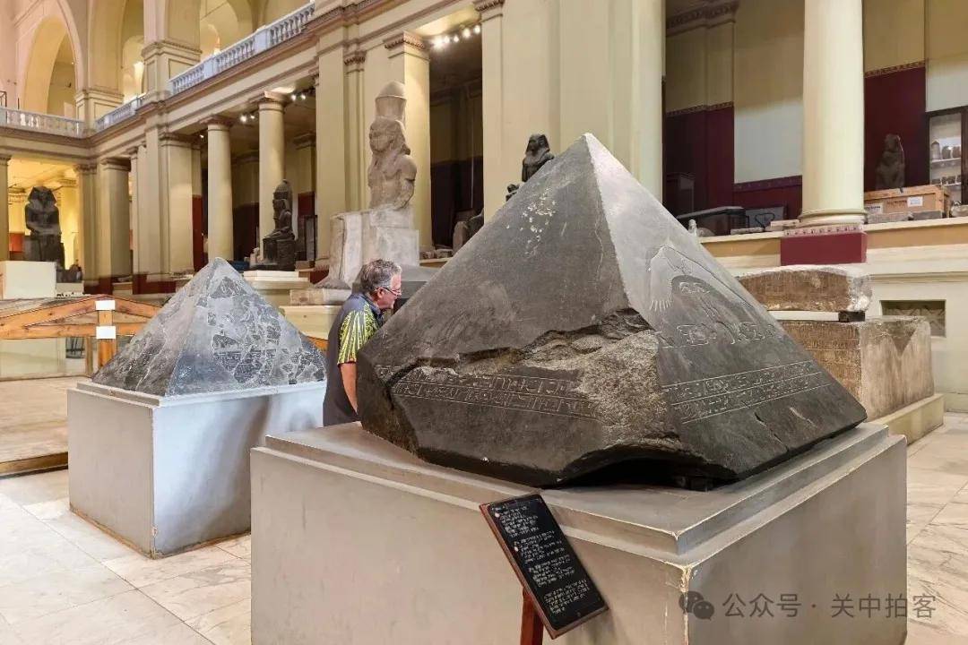 拾级而下,进入中央大厅,先看到两件玄武岩雕刻的金字塔尖。其中,保存较好的金字塔尖来自阿蒙涅姆赫特三世的金字塔顶端,下方雕刻一圈儿象形文字,表达了对太阳神拉的赞美;在南侧的表面上,雕刻着一对眼睛,位于托起圆盘的翅膀之间。