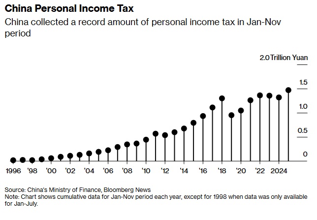 这场追税行动已取得一定初步成效。官方数据显示,在去年前11个月,中国个人所得税收入较2024年增长11.5%,达到创纪录的1.47万亿元人民币。