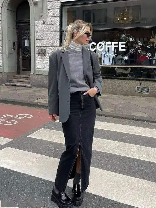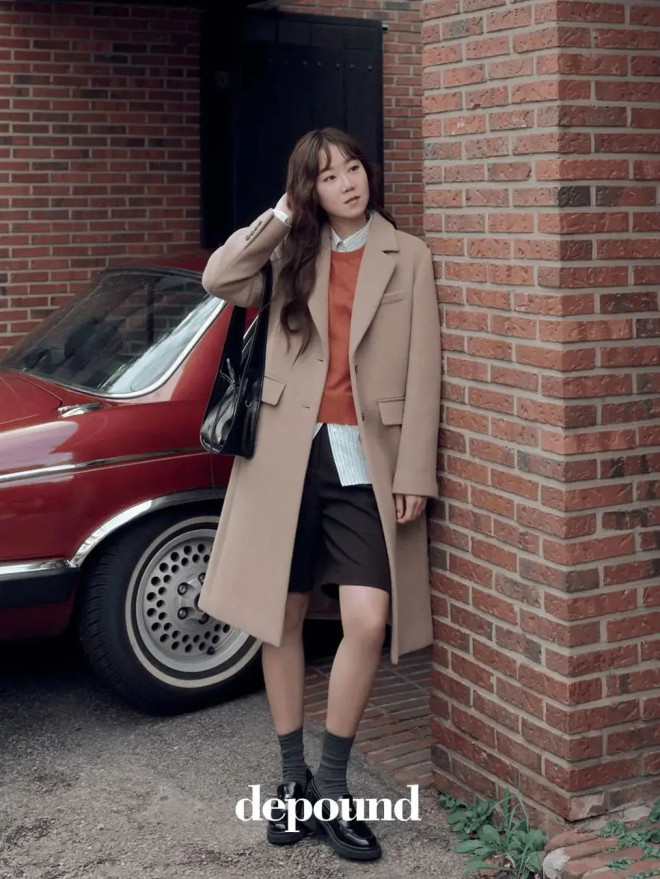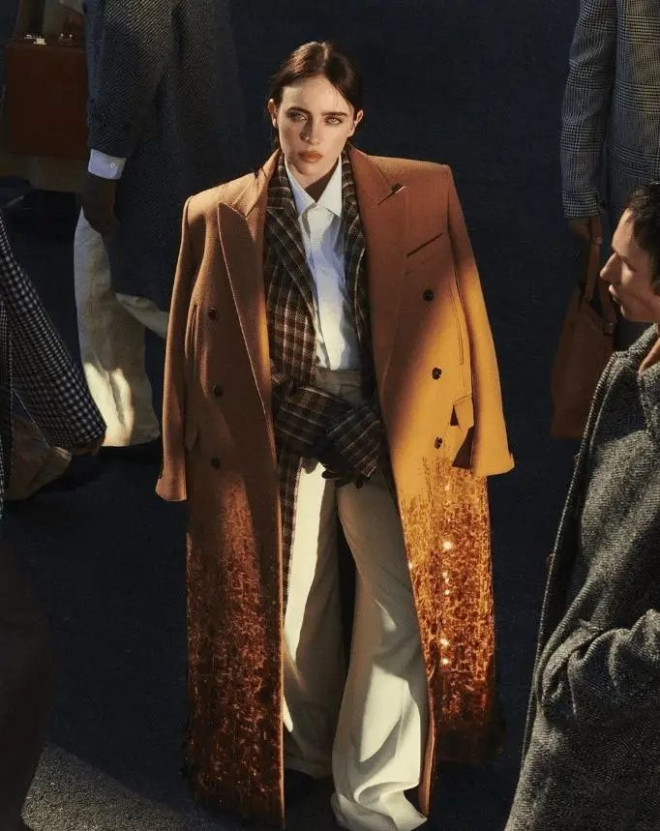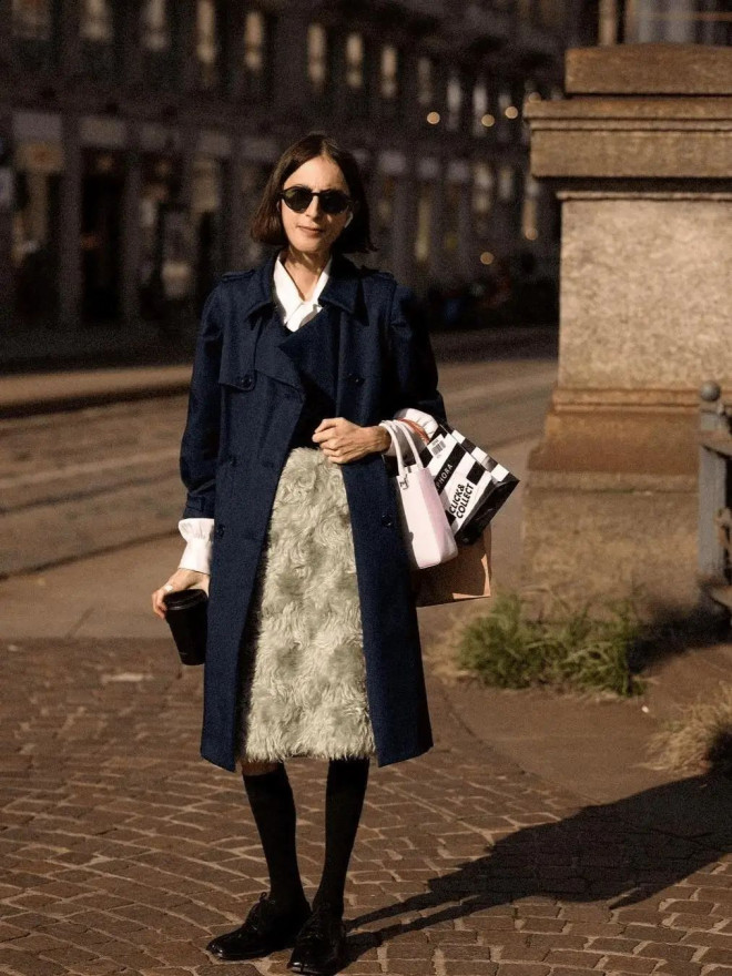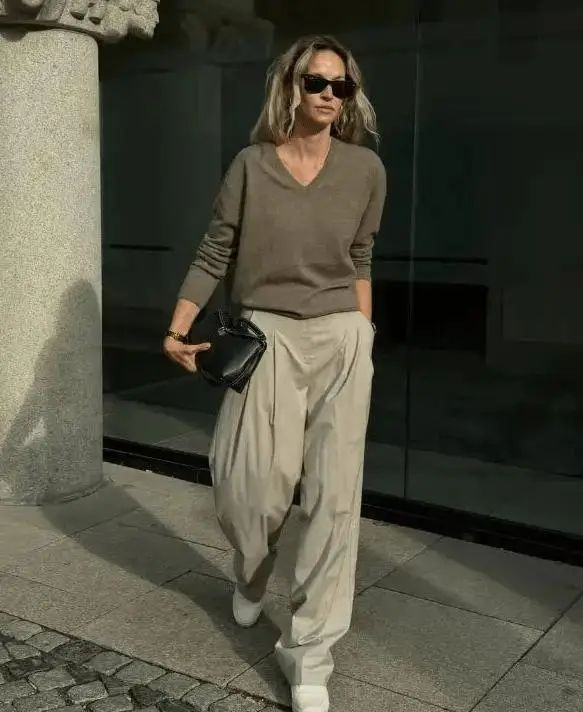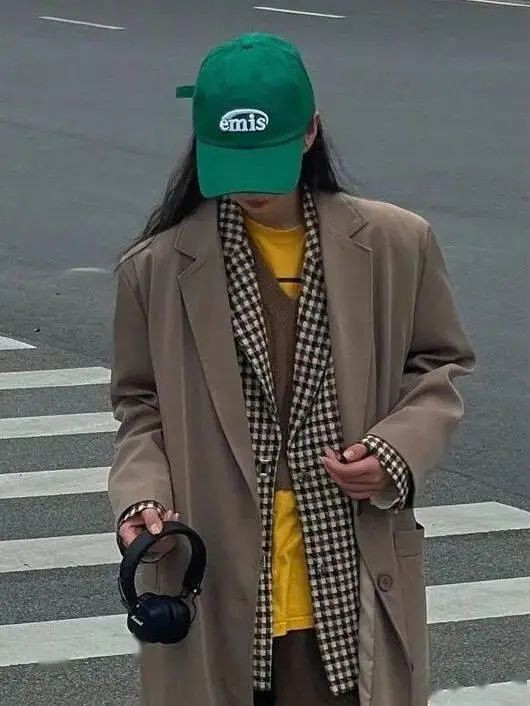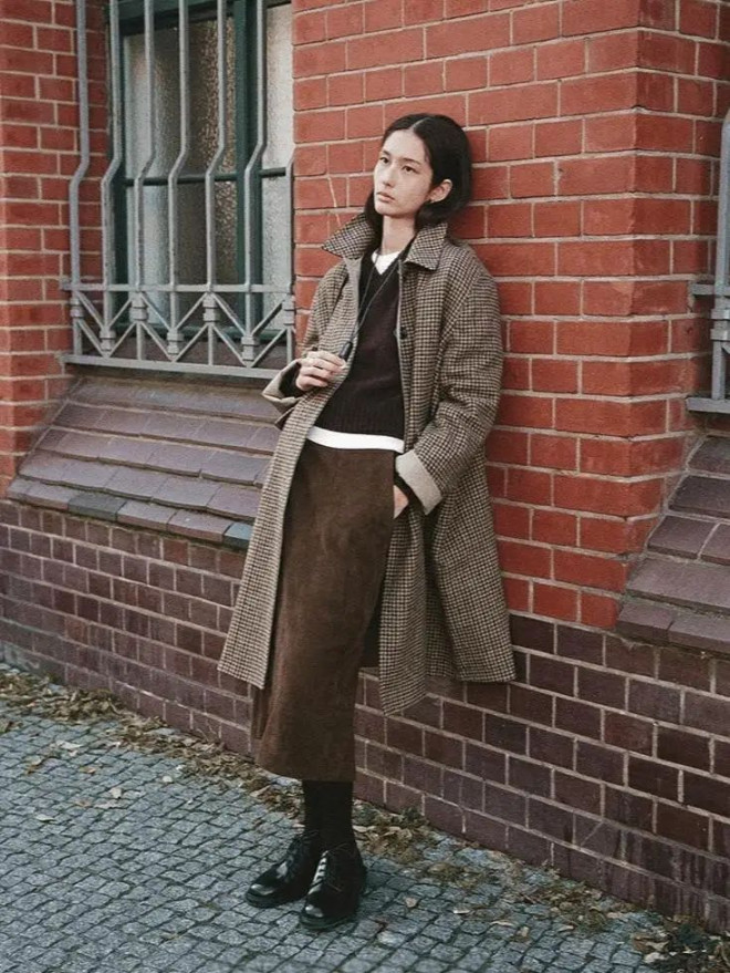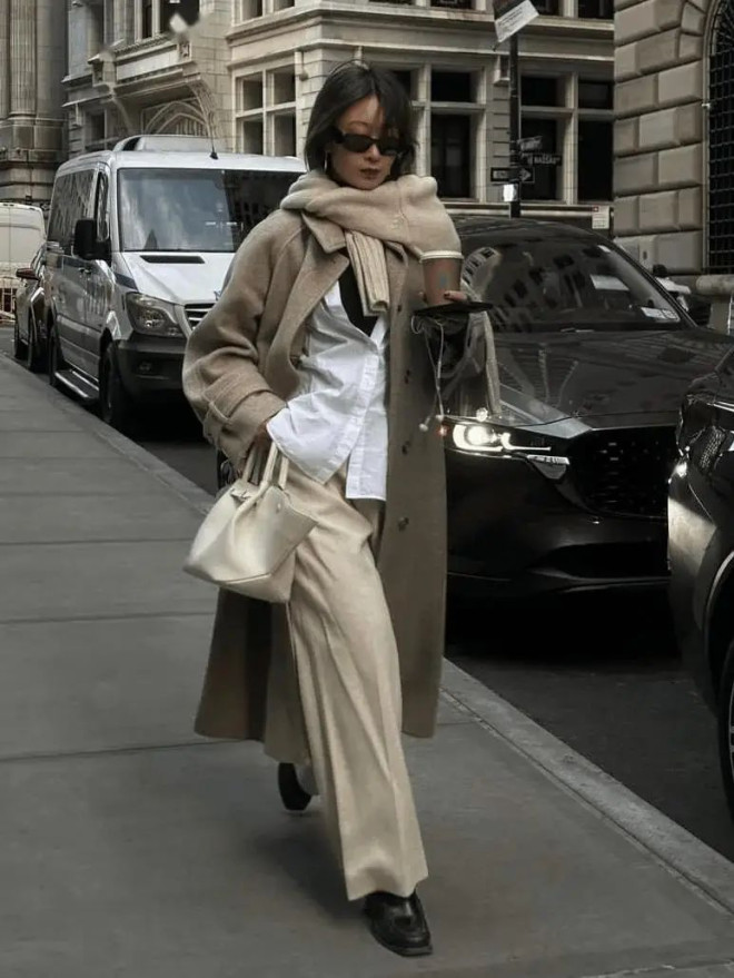 职场场景可尝试灰蓝衬衫叠米白针织背心,外披驼色双面呢大衣,同色系渐变法则让通勤穿搭更显高级。