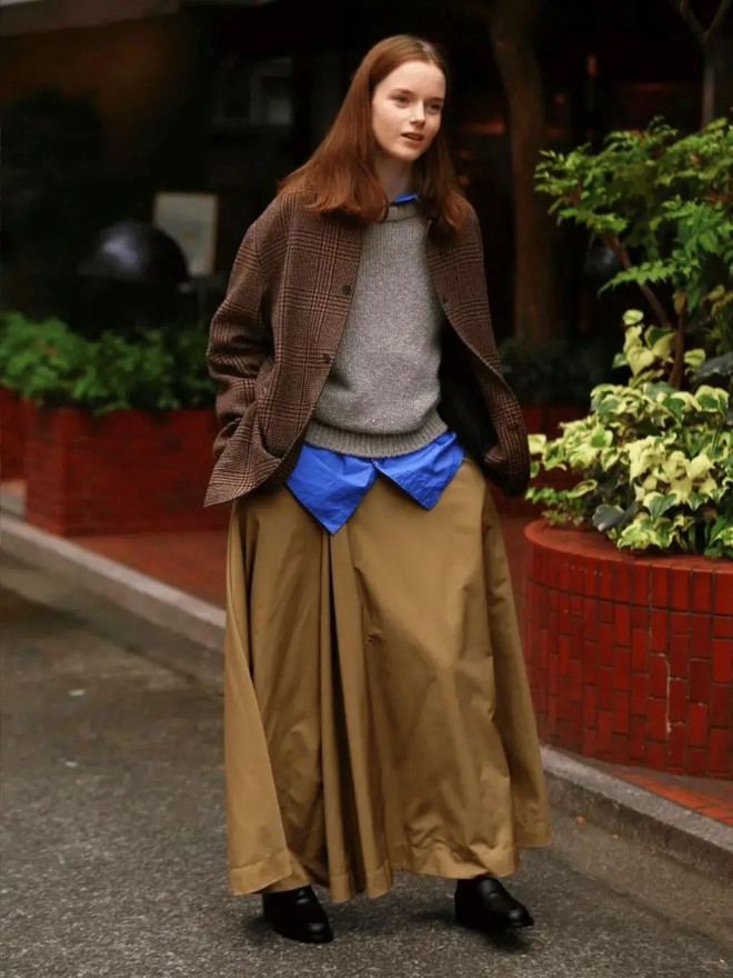 只要换成暖色调,白衬衫+橘色毛衣+卡其色外套,就变成文艺范。叠穿藏肉显瘦,不挑身材。