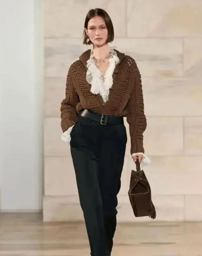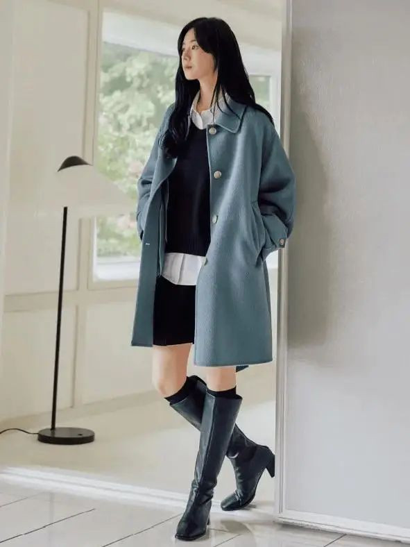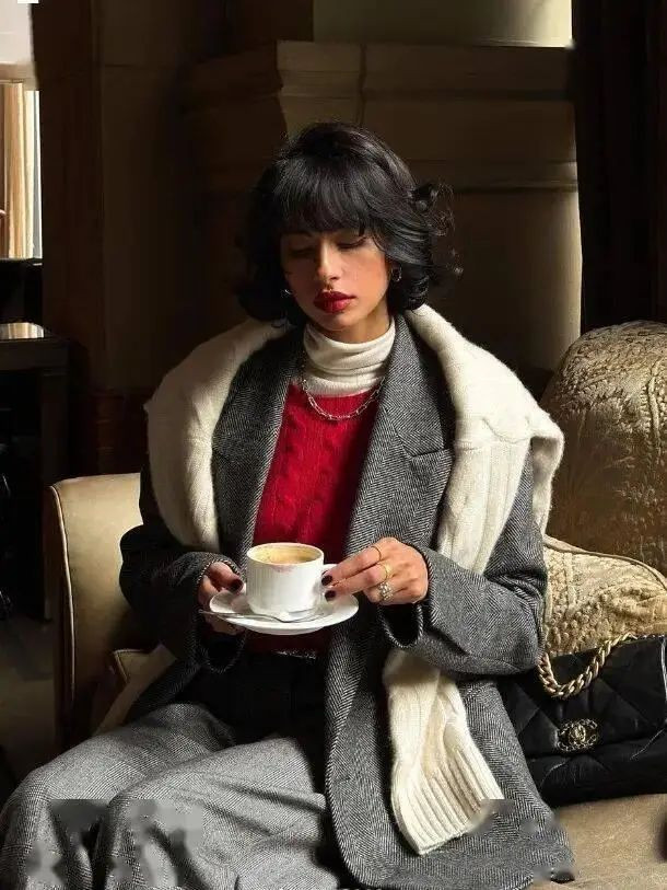 以 “衬衫+针织衫+大衣”为基底模板,通过V领叠穿法打造视觉延伸感。选择精纺羊绒内搭作贴肤层,中叠高领针织衫时解开衬衫顶扣,让领口自然形成三角区,外搭廓形羊毛大衣时将下摆微露1-2cm,既避免臃肿又增添动态美感。
