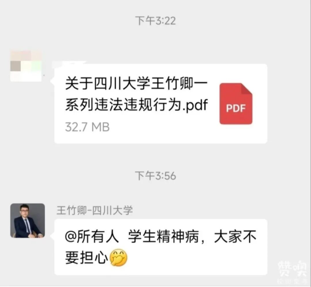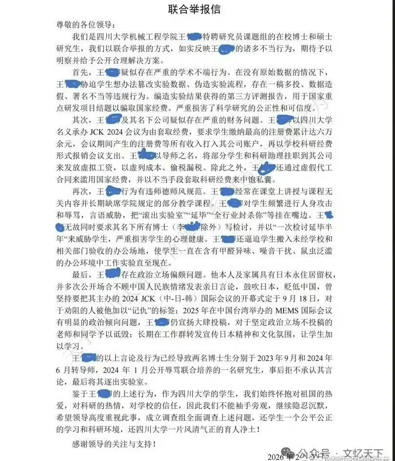 这个瓜就是,四川大学机械工程学院的在校博士和硕士研究生,用联合举报的方式,举报博士生导师王竹卿。