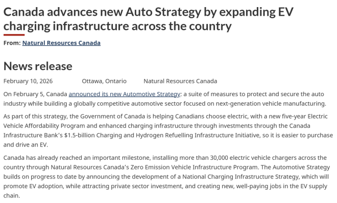 总理马克·卡尼(Mark Carney) 上周表示,联邦政府将拨款15亿加元用于加拿大的电动车基础设施建设,这是联邦汽车战略一揽子调整措施中的一部分。