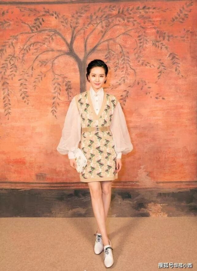 叠穿的v领印花背心连衣裙特别浪漫,浅卡其底色上铺满了粉绿交织的碎花图案,像把春日花园穿在了身上,收腰剪裁勾勒出纤细腰线,短裙摆露出笔直小腿,在复古韵味中透着灵动活力。· 搭配的白色系带皮鞋与整体色调完美呼应,时尚极了。