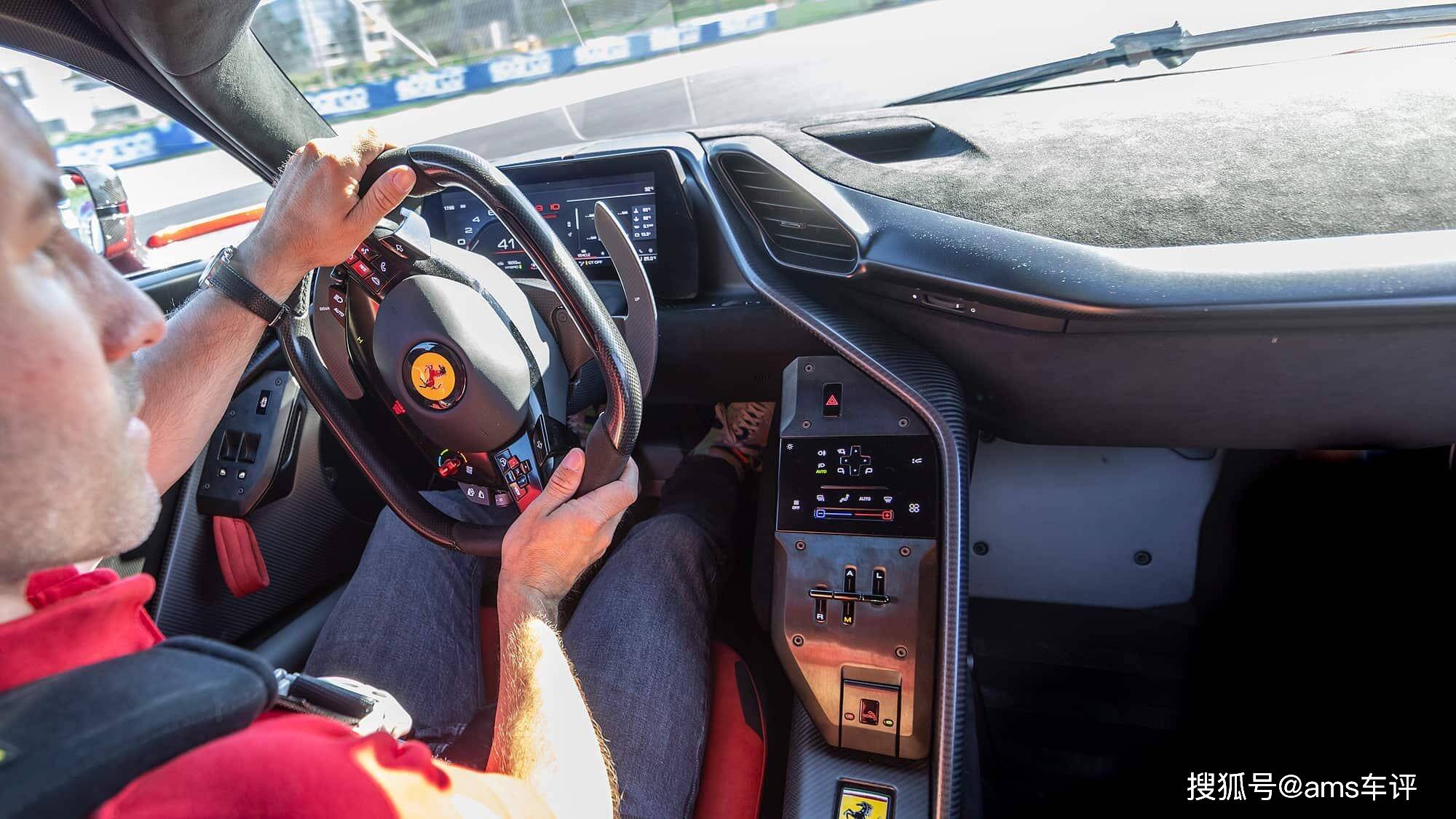 驾驶舱宽度比LaFerrari窄16毫米,驾驶席可前后调节,副驾驶直接坐在碳纤维单体壳上。方向盘支持上下与前后调节,仪表与转向柱固定,方向盘内置换挡提示灯。按下触屏启动键,发动机几乎无震动启动,切换至Performance模式,旋转Manettino至赛道(Race),释放全部动力。