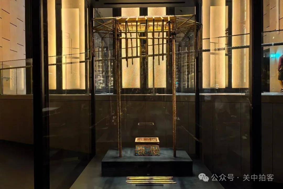 逐层向下,参观完第一个展厅。穿过廊道,进入第二个展厅,尽头竖立着一件金色的仪仗器。好像是华盖的骨架?又好像是棚子的支架?由四个主干支撑起四面坡状的屋檐式顶,结构清晰,四平八稳。