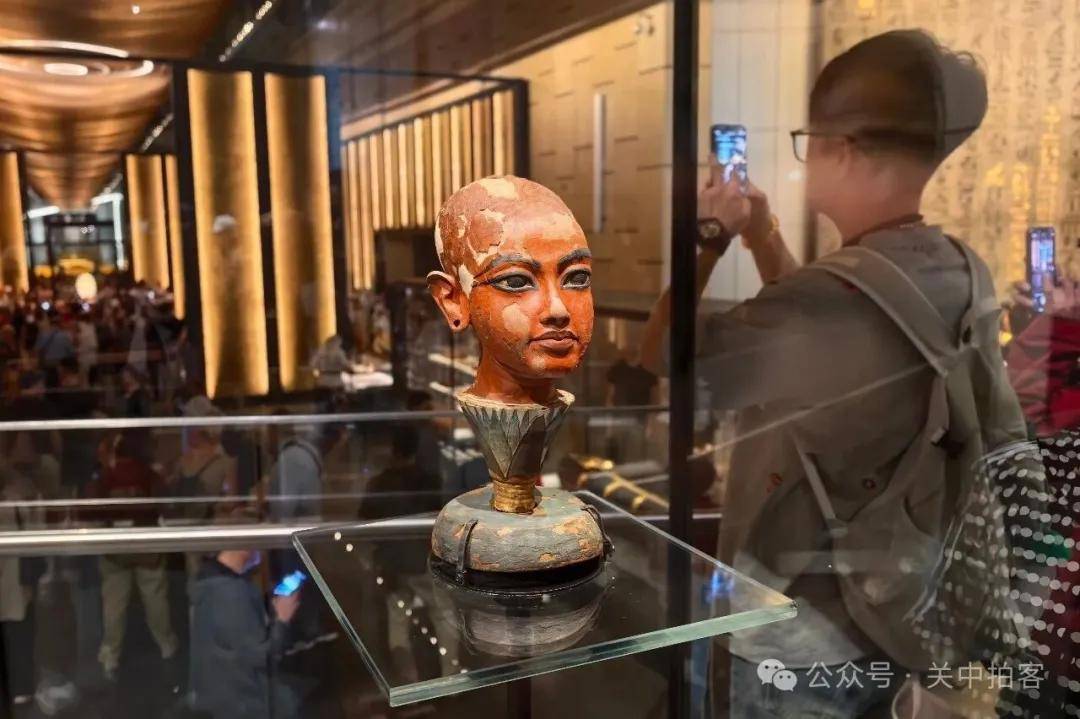 在大埃及博物馆内,最受瞩目的就是图坦卡蒙展厅,游客们排队与黄金面具合影留念。1922年,英国考古学家霍华德·卡特发现图坦卡蒙墓后,首次完整集中地展示出土的全部5992件珍贵文物——