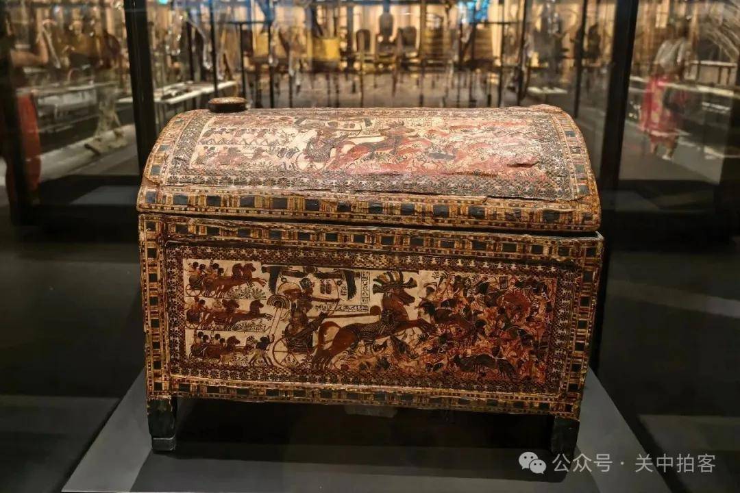 在一件彩绘木箱子上,描绘了法老驾驶战车的场景。他站在车厢里,缰绳系在腰部,左手握弓,右手射箭。前方的敌人四散逃亡,后方的埃及军队整齐排列。当时,在木箱里,盛放着凉鞋、头枕、衣服、项链、皮带等生活用品。