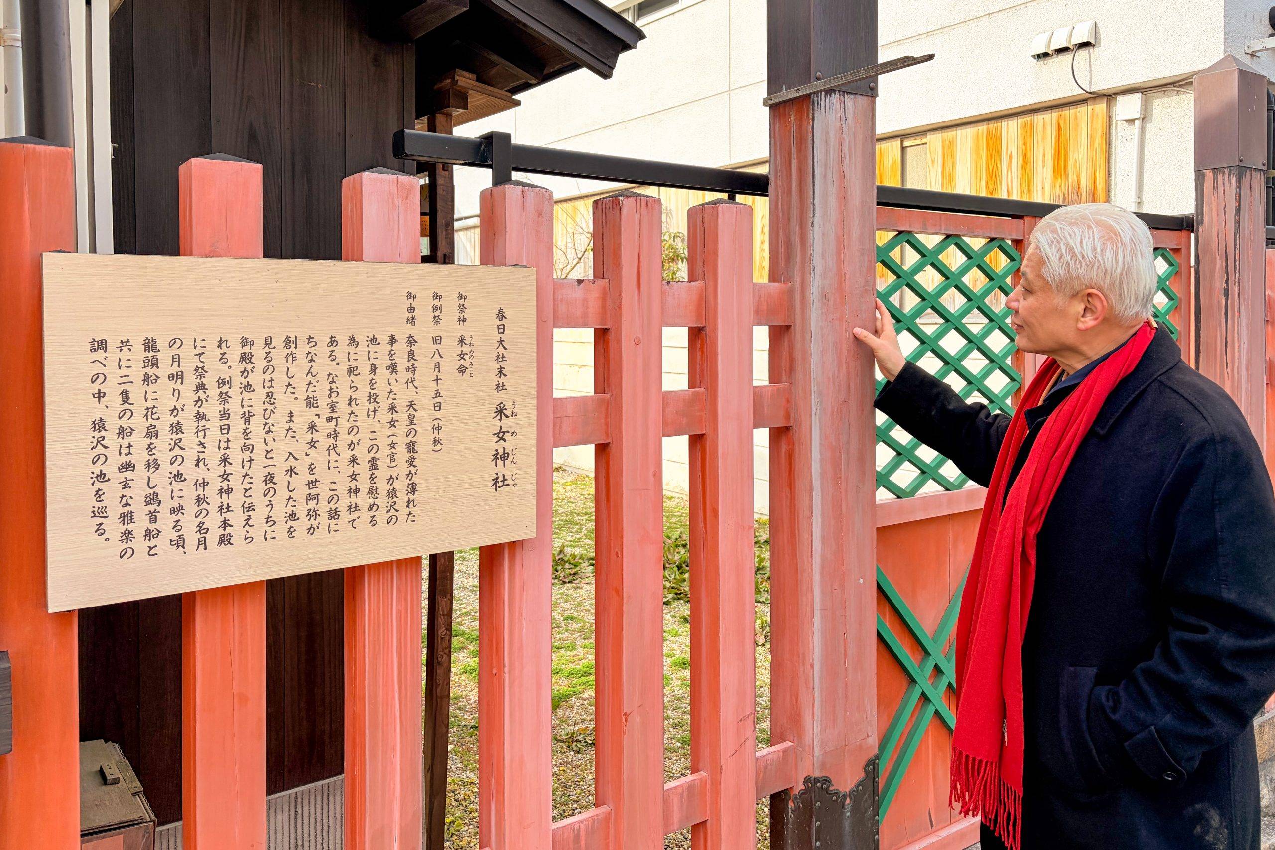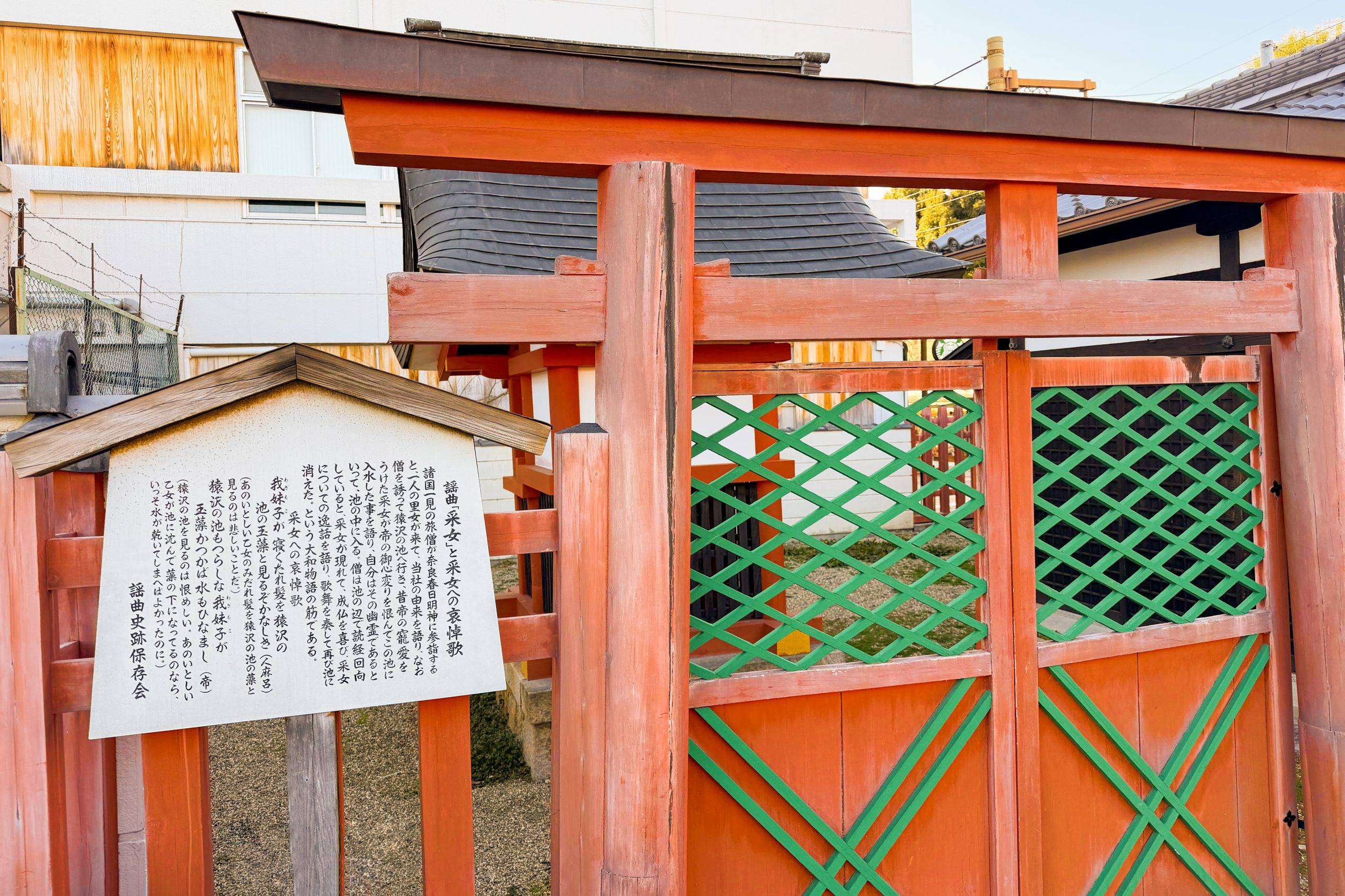 站在神社前的第一眼,心底便升起一种难以言喻的滞涩感。这是一种视觉与逻辑上的巨大冲突。凡建筑者,莫不讲求“向阳”或“开阔”,日本的神社大多如此,通常都会向着水源或神路敞开,以接纳神灵的注视。然而,这座采女神社却像是在大年初一的喜庆里,生生打了一个不合时宜的褶皱:它是背对着猿泽池的。