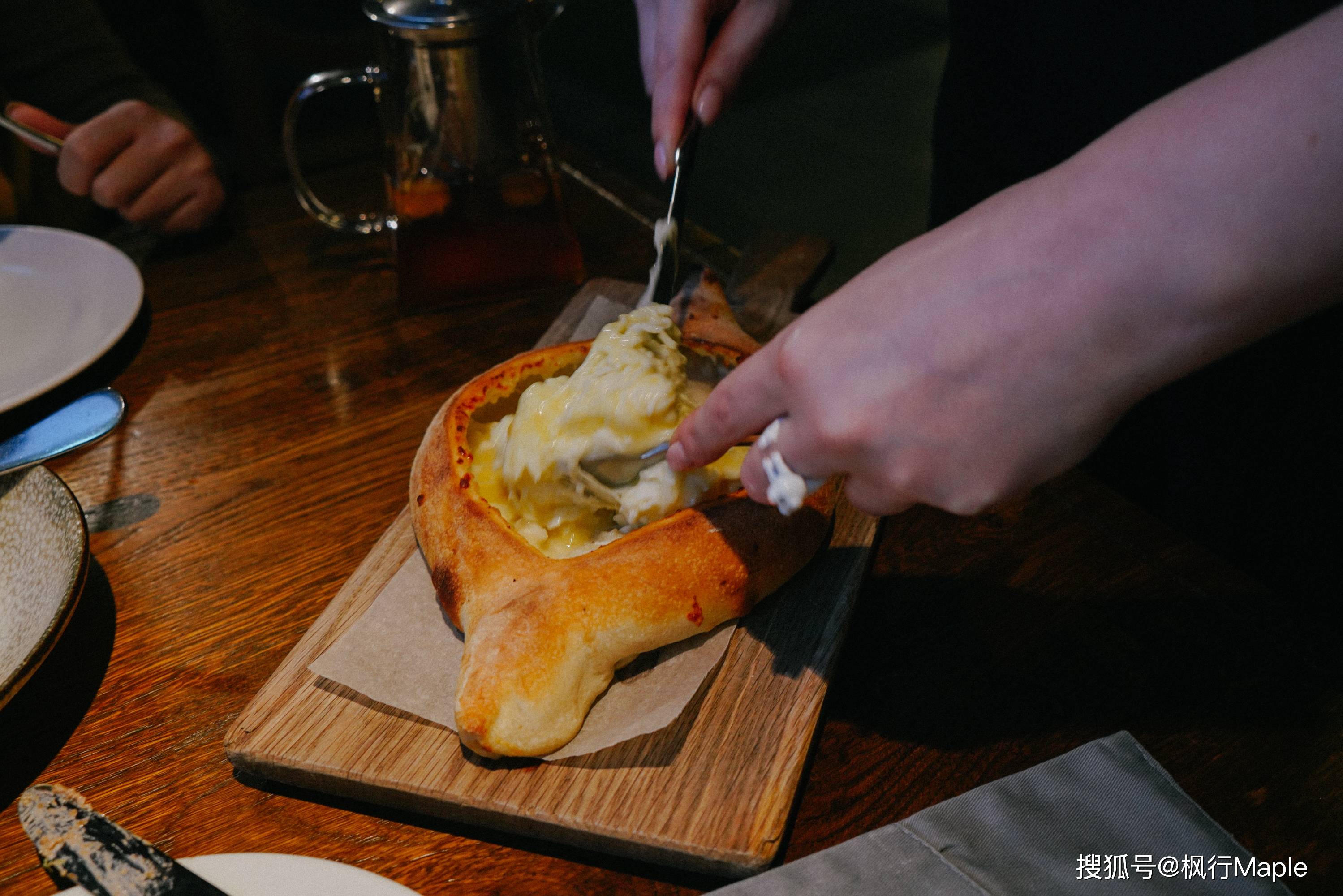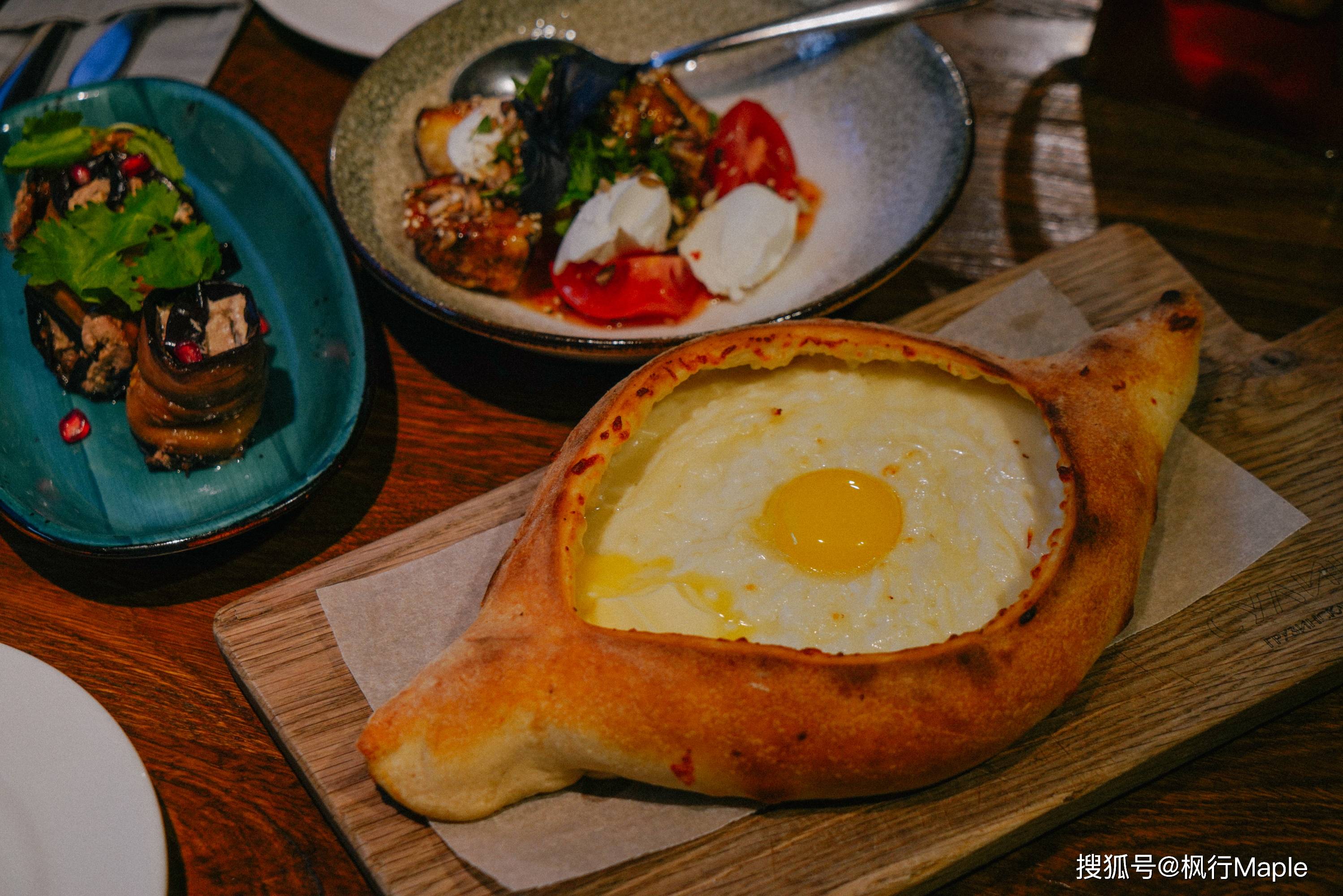 Khachapuri(哈恰普里):一种船形烤饼,在类似披萨炉一样的装置中烤熟,中间是融化的苏鲁古尼奶酪和半熟蛋黄(象征海与太阳)。吃的时候,服务员会帮忙快速搅拌奶酪和蛋黄,当奶酪拉丝,看不清蛋黄状态之后,就可以吃了。面包蘸着奶酪,第一口咸,第二口第三口吃出来奶香和麦香。