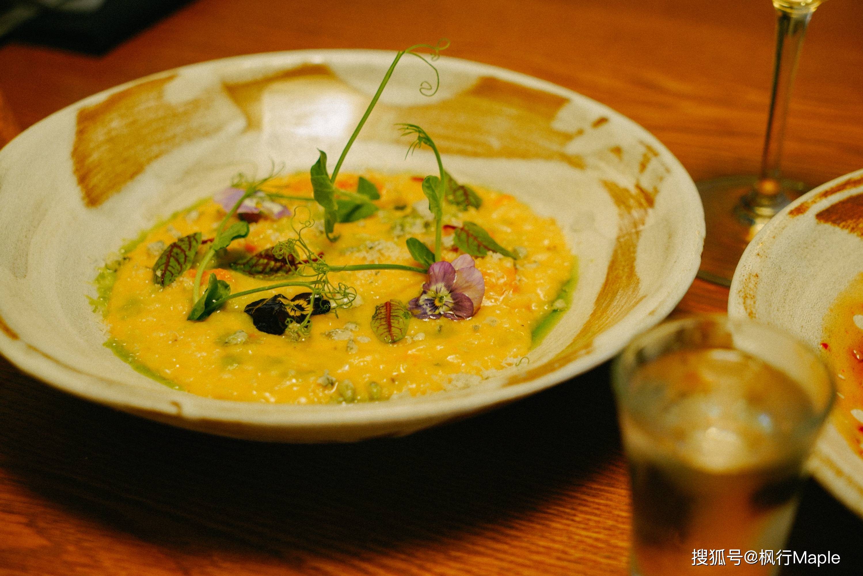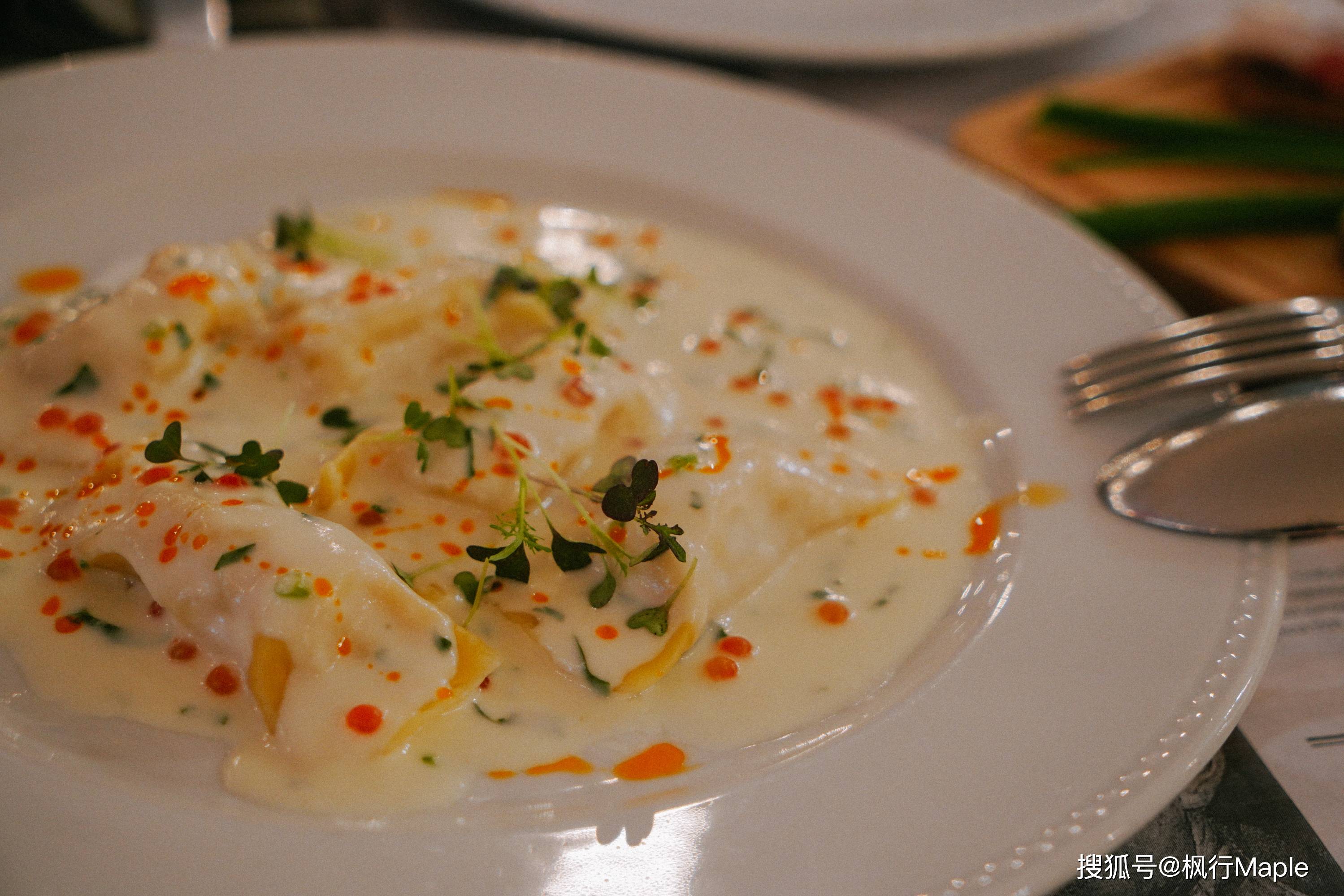 [远东螃蟹、鳕鱼、奶油鱼子酱汁饺子],食材很有俄罗斯东部海岸的风格,做法精致,相当美味,最后用面包把酱汁都抹干净吃了。