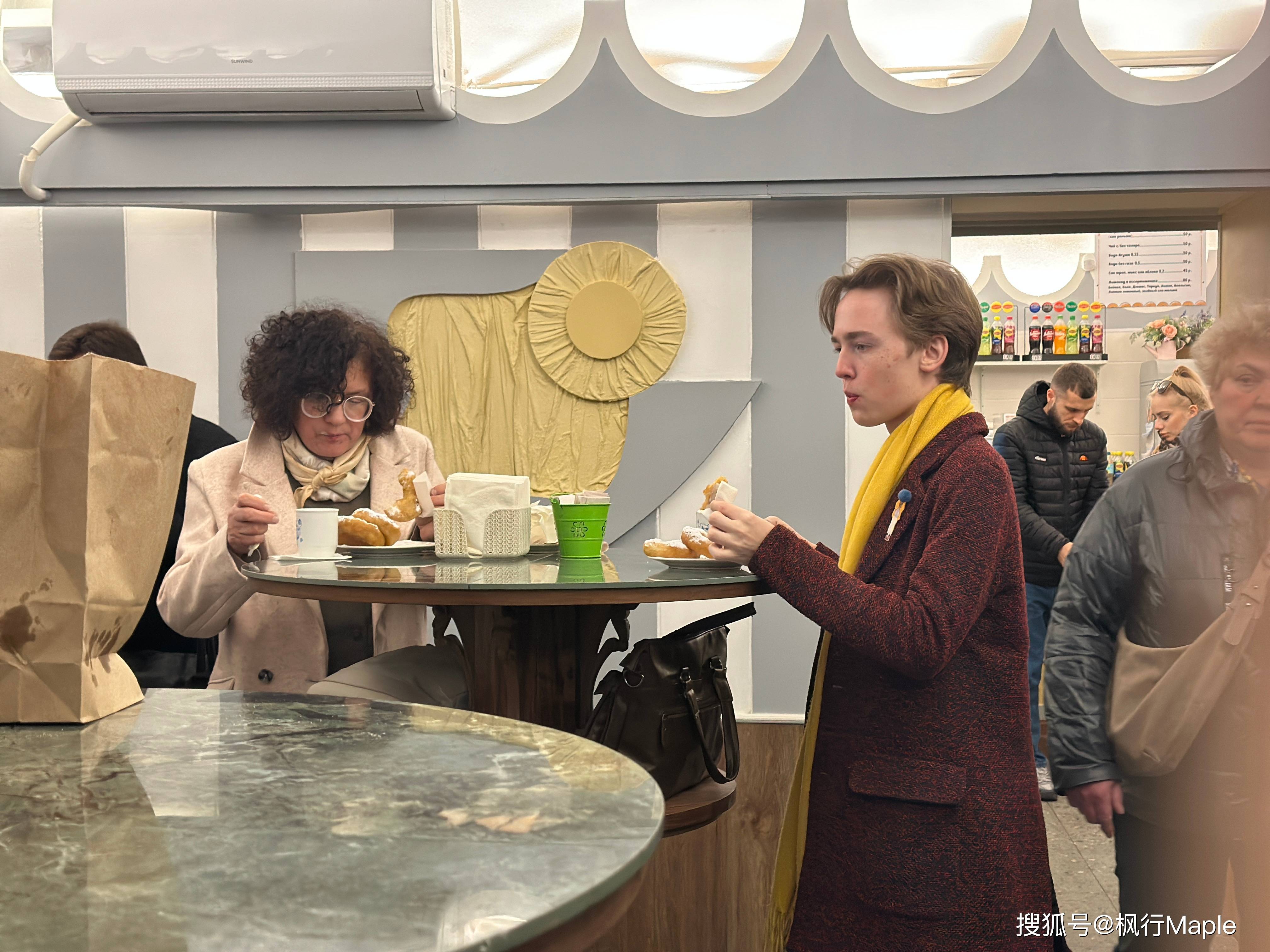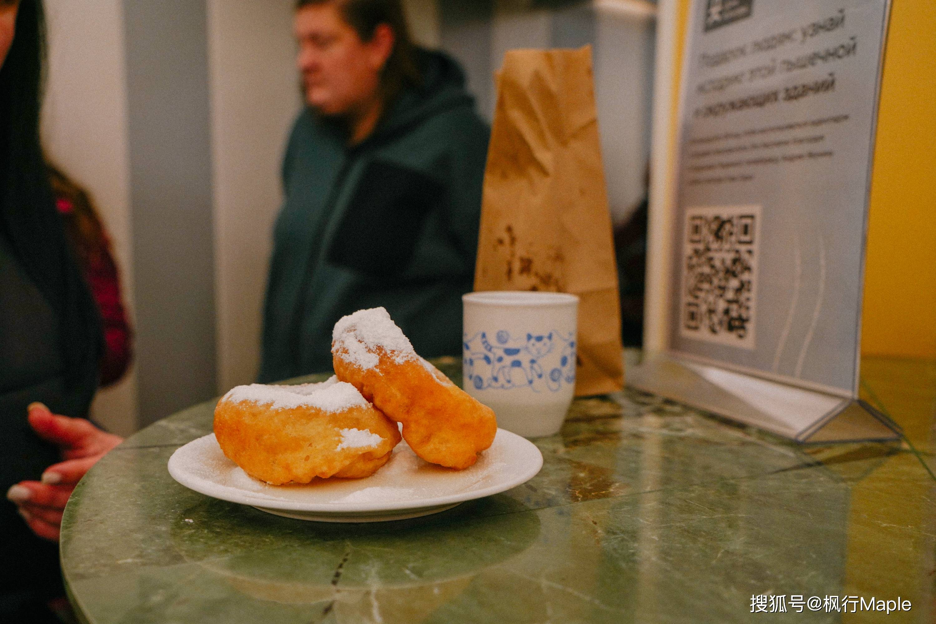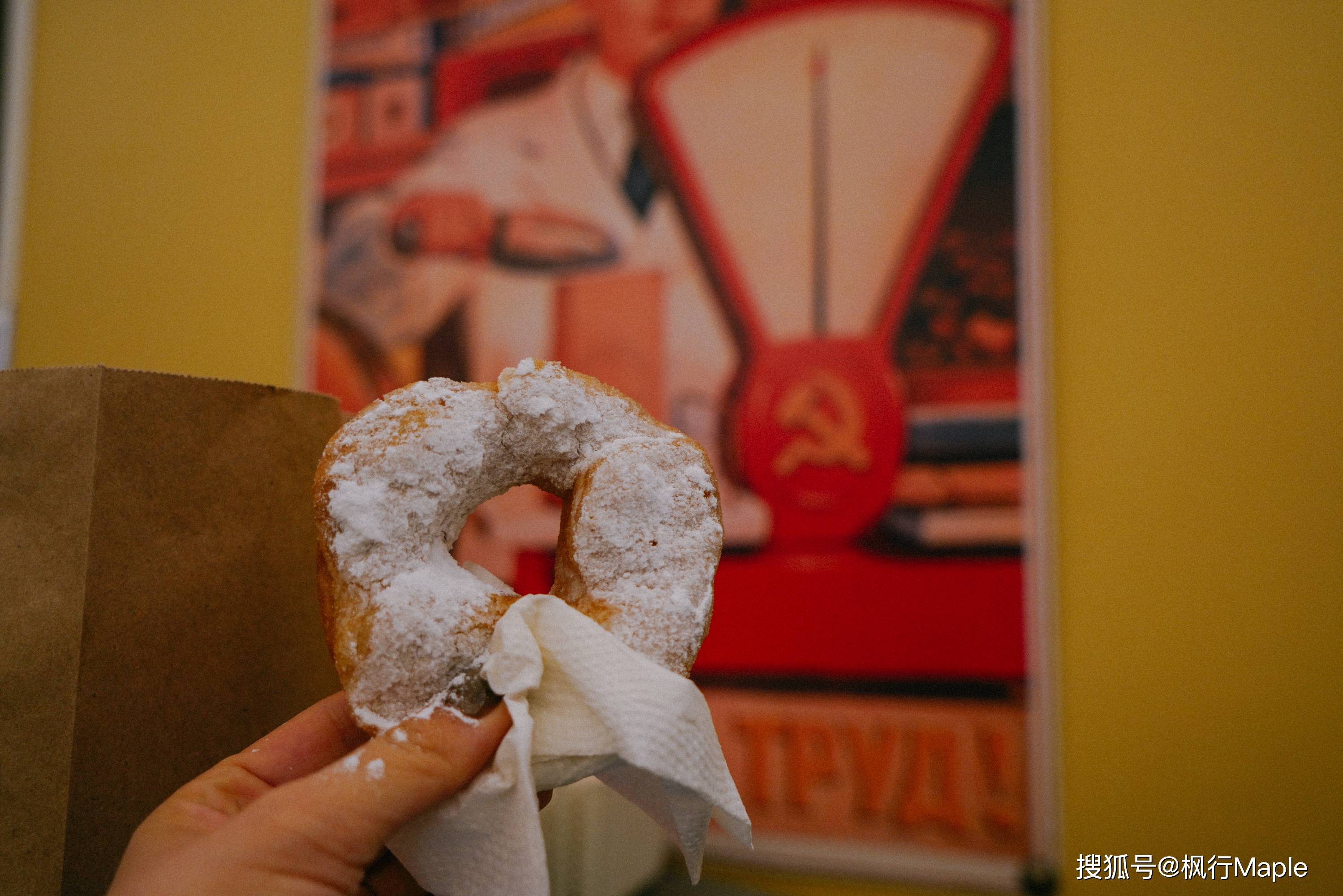 立吞区和就餐区每个人手里的纸袋子都快速被甜甜圈上的油洇出一片痕迹。拿这刚热乎的甜甜圈吃一口,糖分油分碳水的混合物,可以在寒冷的圣彼得堡成为传承美食,果然是站得住脚的!