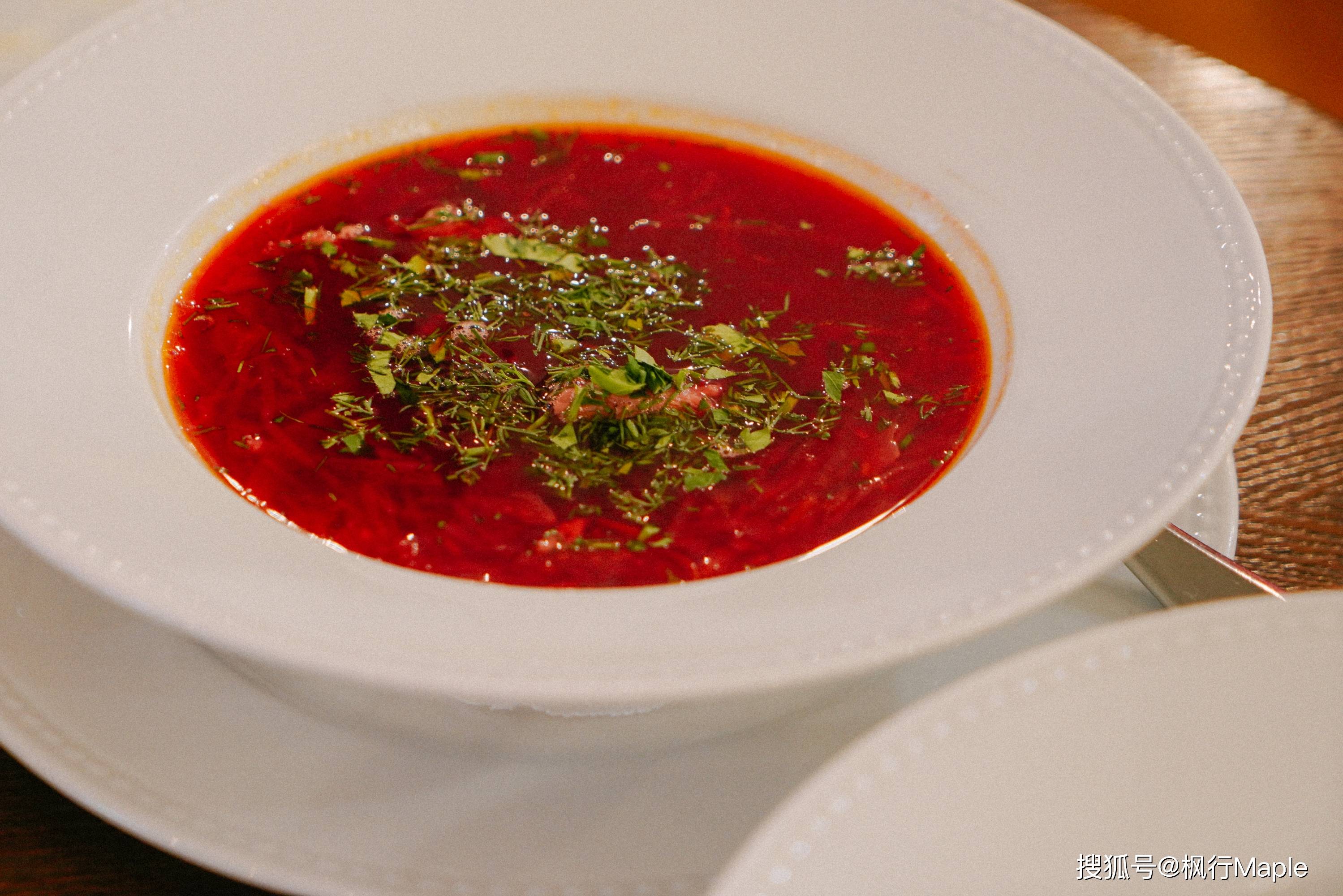 比如一碗红菜汤(Borscht),酸甜口,带一点牛肉的鲜香,喝的时候加一点酸奶油,喝起来竟有点像番茄牛腩汤的“东欧表亲”。