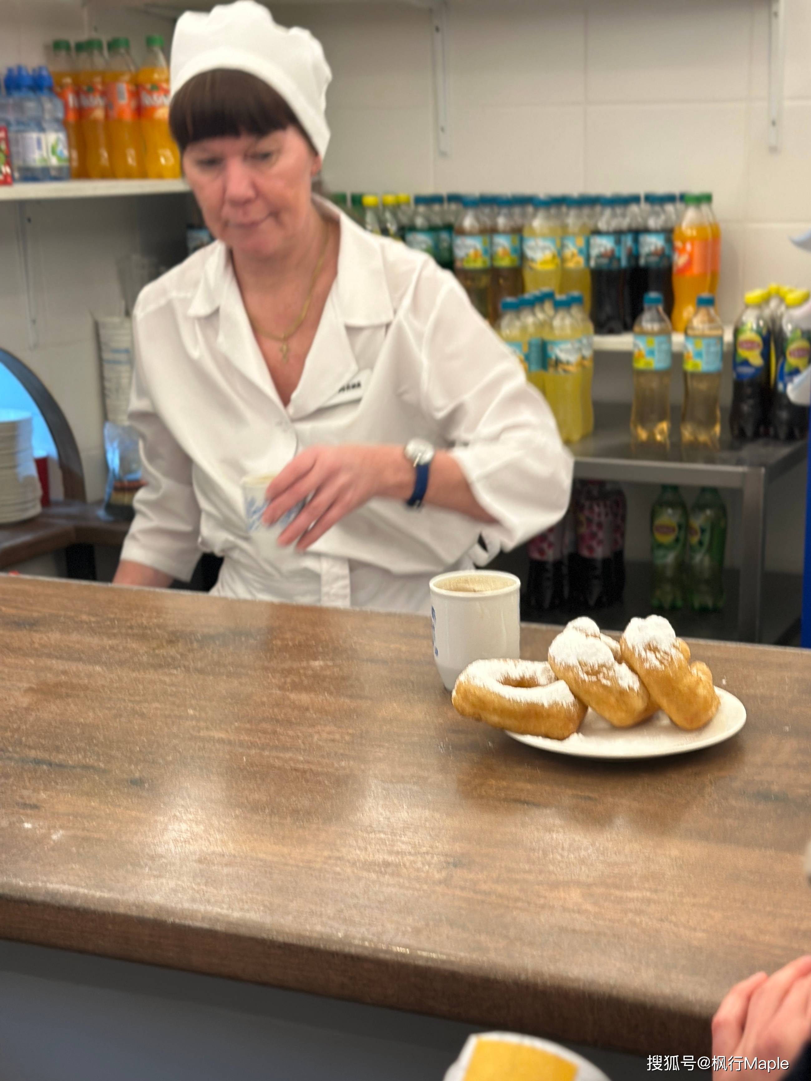 100卢布4个甜甜圈,排到的人迅速报数,阿姨把甜甜圈丢到纸口袋里,再洒一勺子糖粉递给你。结账,走人。