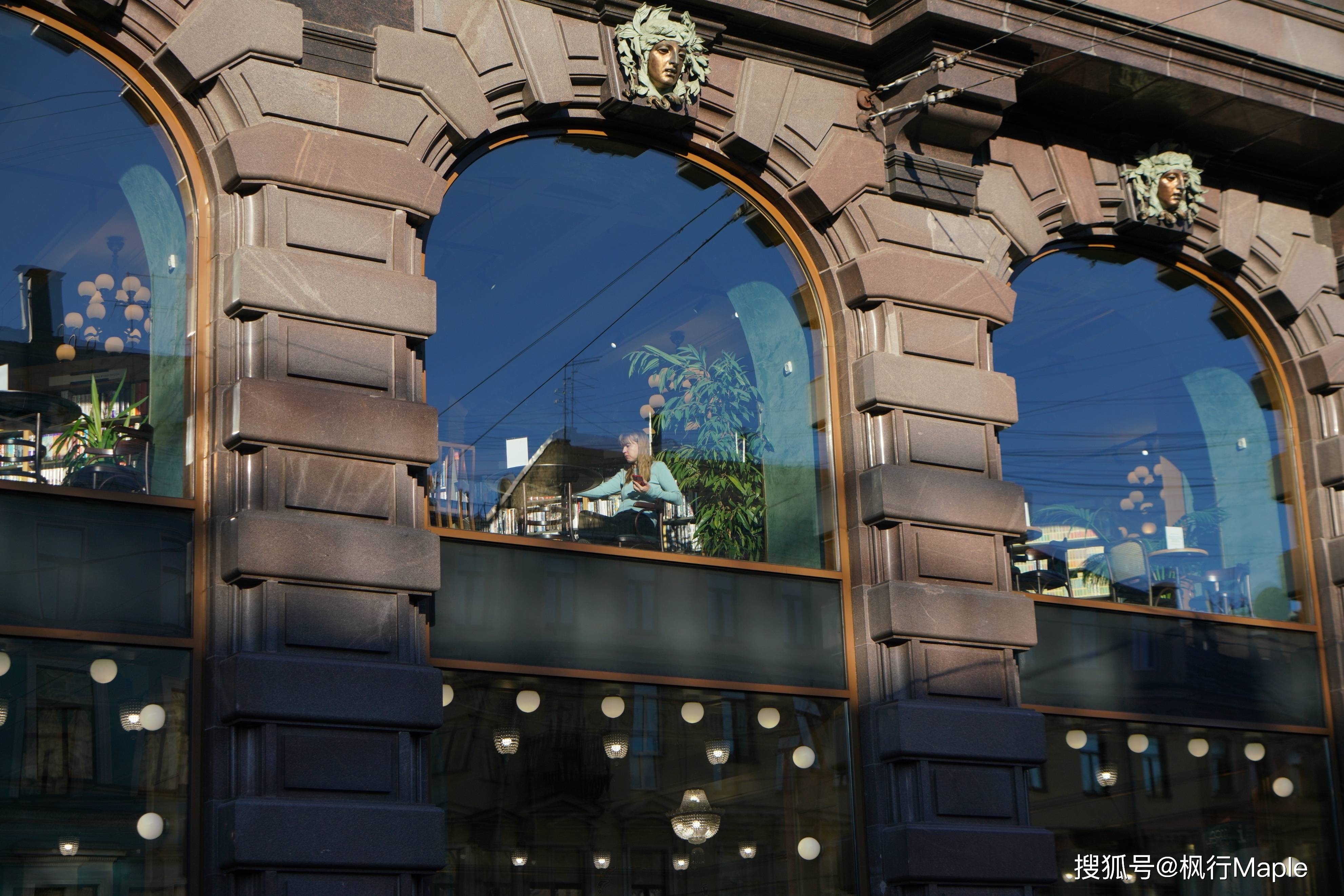正对喀山大教堂,巨大的半圆形玻璃外是忙碌的涅瓦大街和古老历史建筑。