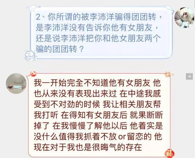 但后来她知道这件事后,在去年9月就跟李沛洋断了,说觉得“晦气”。这样情况下,她并不存在大家说的“知三当三”的情况,说自己也是受害者。