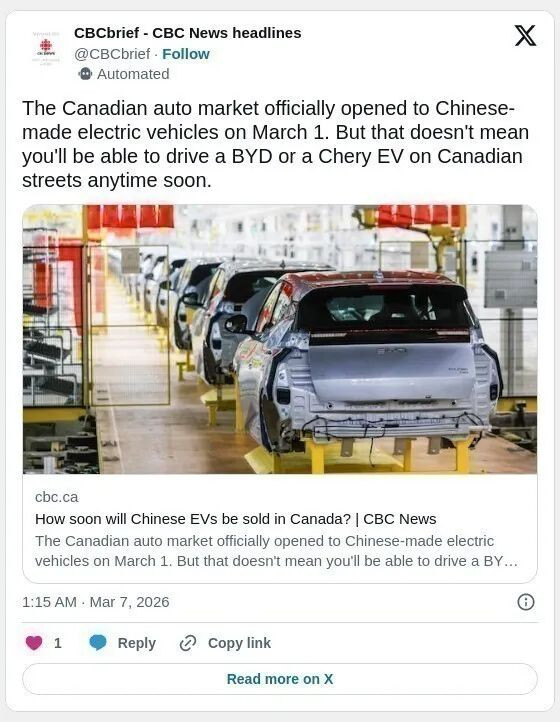 2026年3月1日,加拿大汽车市场正式向中国制造的电动汽车开放。然而,这并不意味着消费者很快就能在加拿大街头看到比亚迪(BYD) 或奇瑞( Chery EV)的车型。