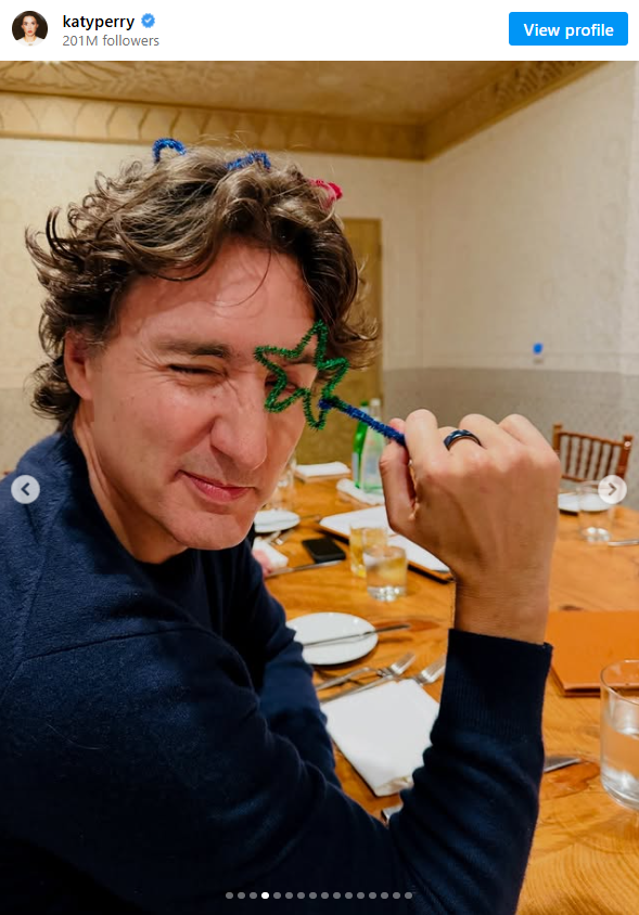 这位流行天后周三在Instagram上发布了一组生活照片,其中包括一张她与特鲁多搞怪合影的照片,还有一张他拿着一根用毛根做成的小魔法棒,摆出搞笑姿势挡在脸前的画面。