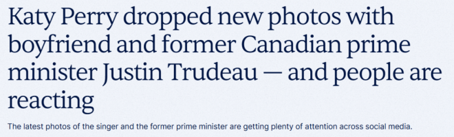 Perry和特鲁多最早在2025年被传出恋情,当时只是约会传闻,后来两人在当年晚些时候公开承认了关系。此后,这对情侣偶尔也会在社交媒体上分享一些相处的片段,比如一起度假或外出活动的照片。