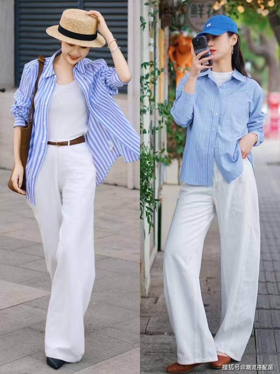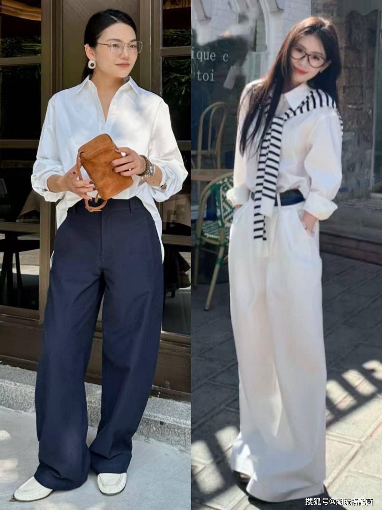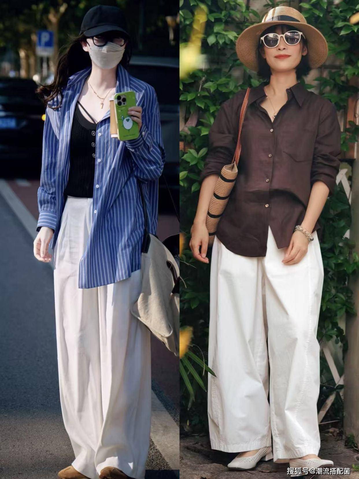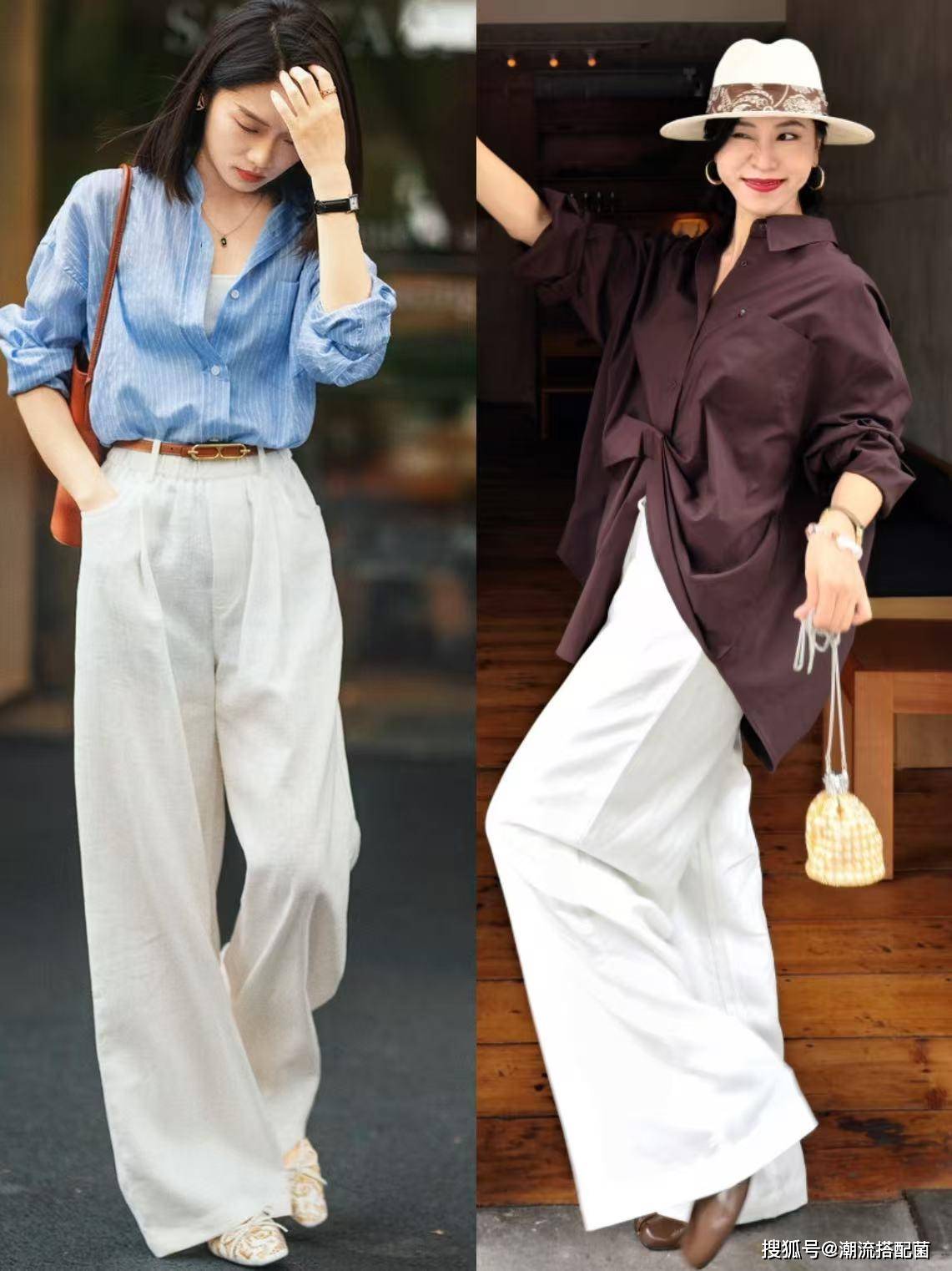 比如像是咖色衬衫和条纹衬衫,这些衬衫虽然自带优雅高级感,但对于30+女性来说会显得有些老气,那么我们可以选择搭配白色阔腿裤,整个造型穿搭清爽又亮眼。