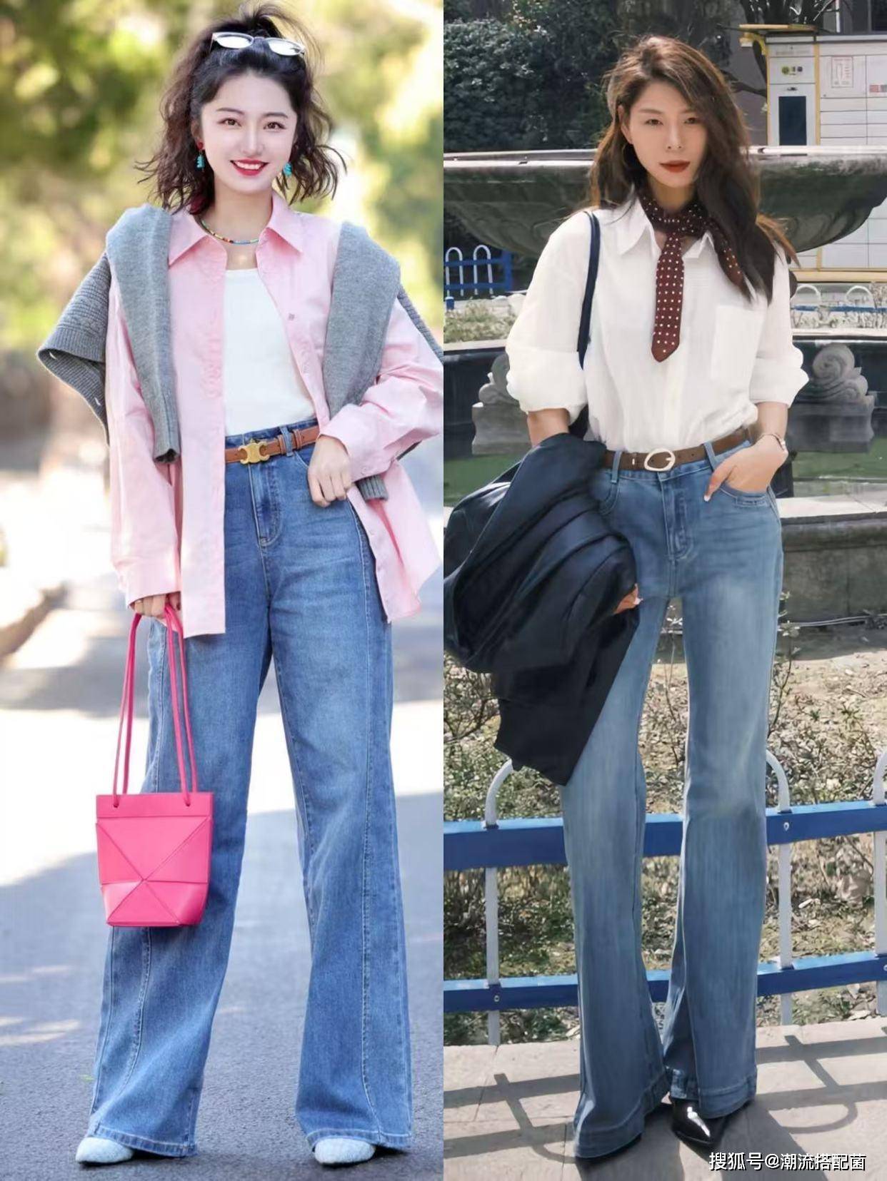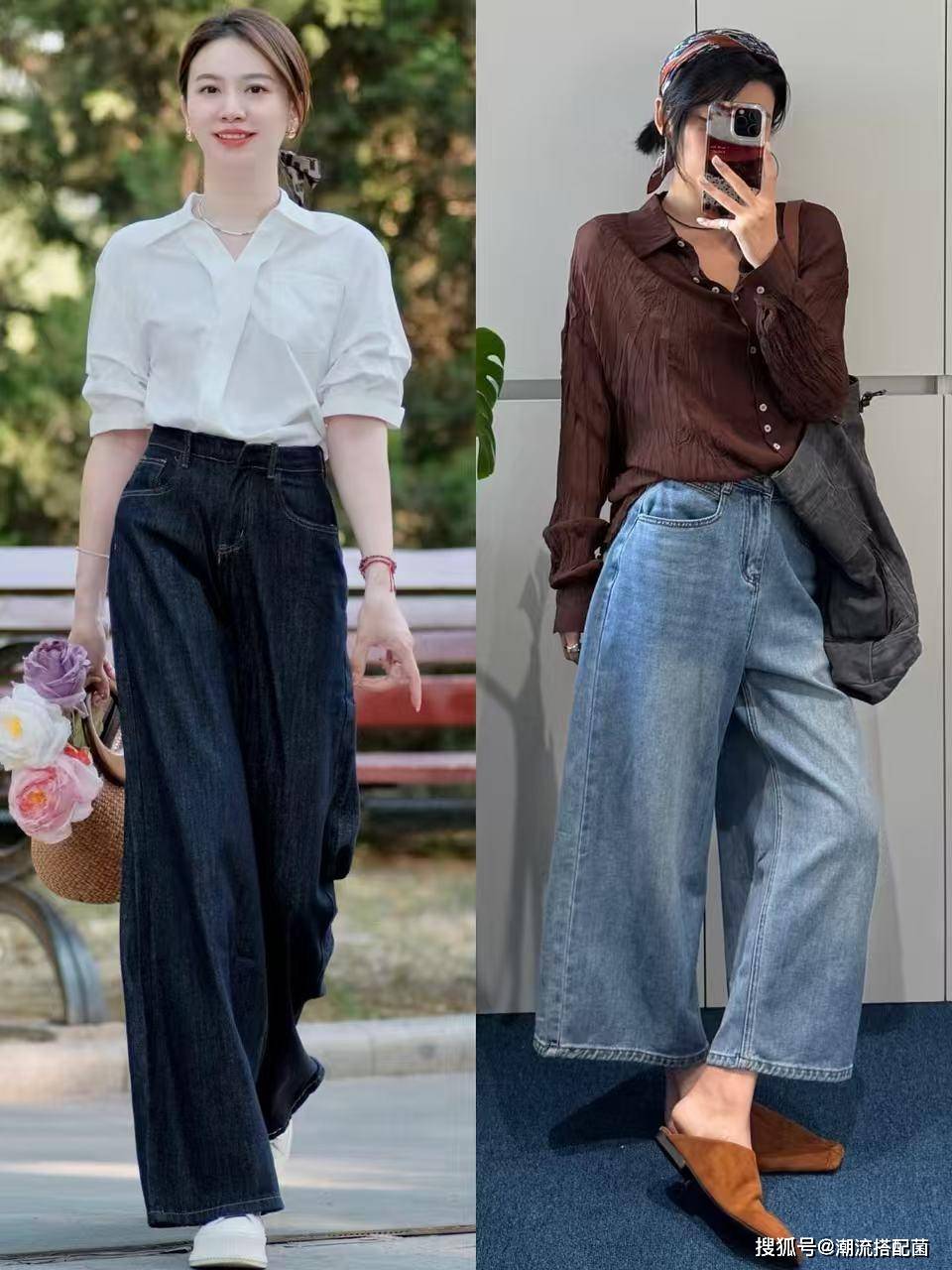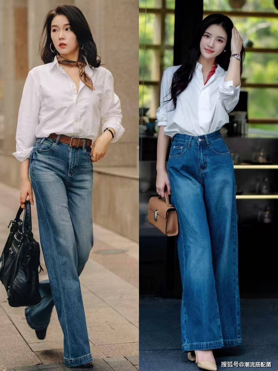 衬衫+牛仔阔腿裤