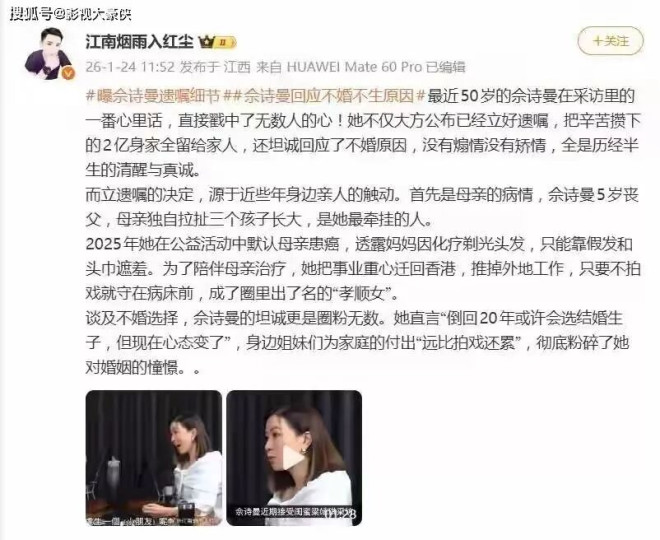 当“50岁佘诗曼已提前立好遗嘱”的消息传出,社交平台上掀起了一阵热议。有人感叹“太早了吧”,有人表示“理解但不忍细想”,而更多理性声音则在赞赏这份成年人少有的清醒。