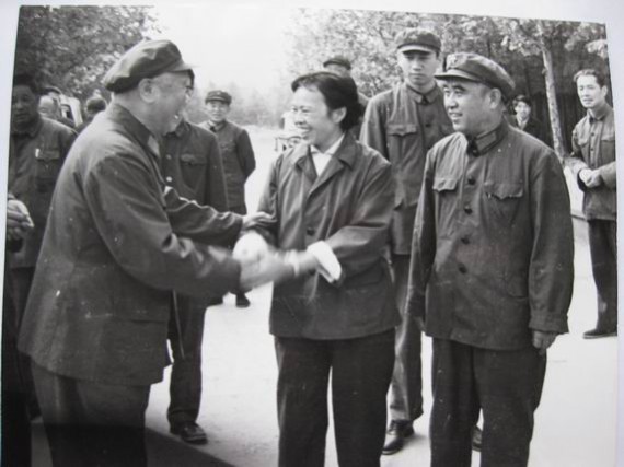 时任全国政协副主席的陈再道(左一)到基层视察与当地领导亲切握手