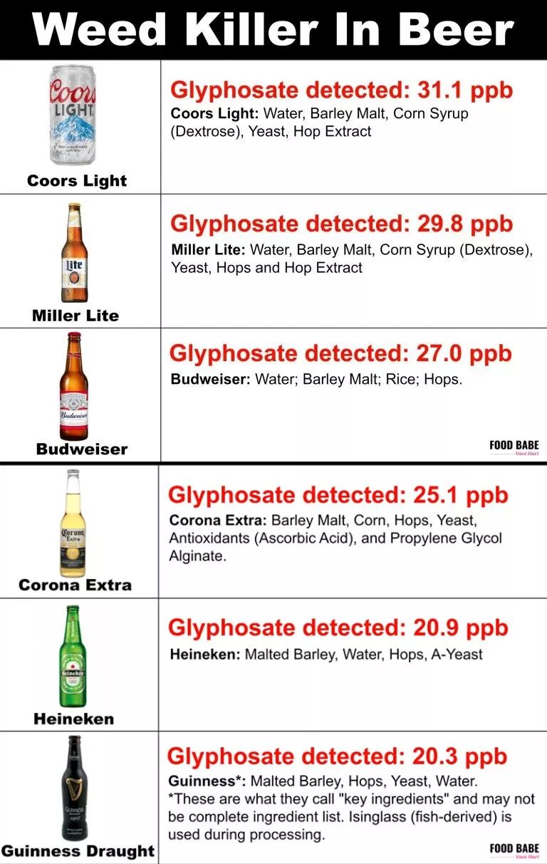 在美国公共利益小组对全球畅销的十几个啤酒品牌和葡萄酒品牌进行检测时,发现绝大多数都含有除草剂成分——草甘膦,不仅仅是青岛啤酒!