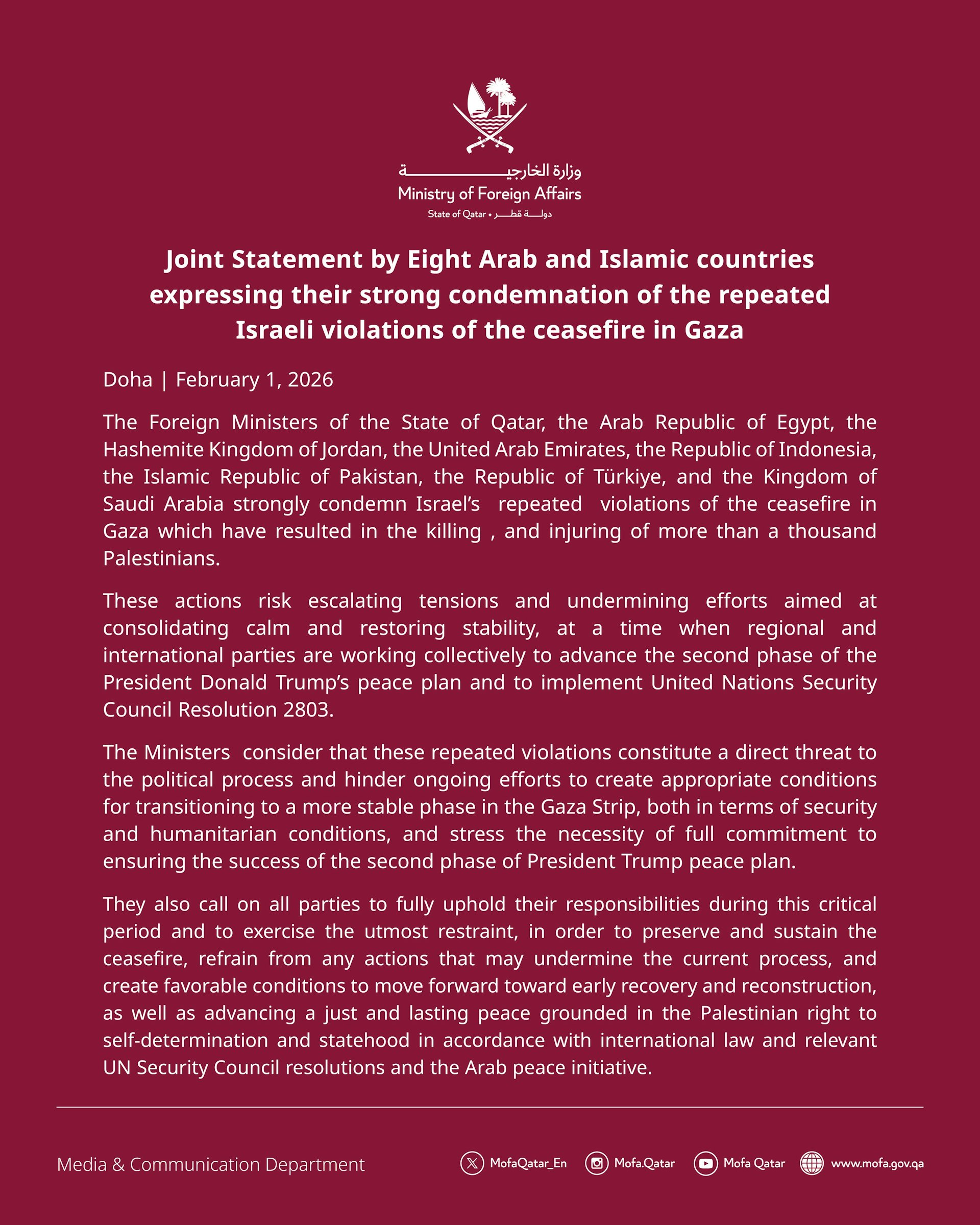 卡塔尔外交部2月1日表示,卡塔尔、埃及、约旦、阿联酋、印尼、巴基斯坦、土耳其和沙特八国外交部长发表联合声明,强烈谴责以色列一再违反加沙停火协议,在近期导致一千多名巴勒斯坦人伤亡。卡塔尔外交部在X发布的八国外长联合声明称,在区域和国际各方正共同努力推进美国总统川普(Donald Trump,又译川普)和平计划第二阶段并执行联合国安理会第2803号决议之际,这些行动有可能加剧紧张局势,破坏旨在巩固平静