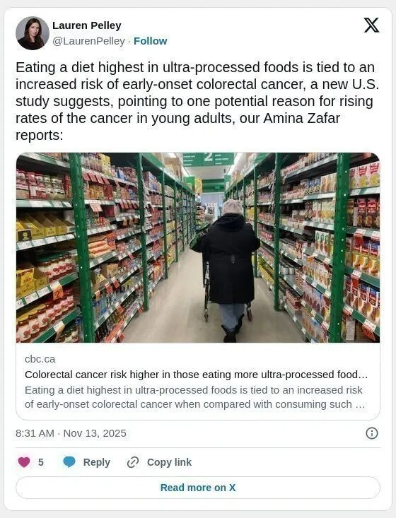 越来越多证据显示,过量食用超加工食品可能与年轻人结直肠癌(colorectal cancer)发病风险升高有关。哈佛大学领导的一项长期研究发现,长期食用这类食品的人患肠息肉——结直肠癌前病变——的风险比少量摄入者高约1.45倍。什么是超加工食品?超加工食品通常指即食或即热食品,含有高糖、高盐、饱和脂肪及各种食品添加剂,以延长保质期并便于保存。这类食品包括工业化面包、早餐谷物、方便面、罐装汤等。近年